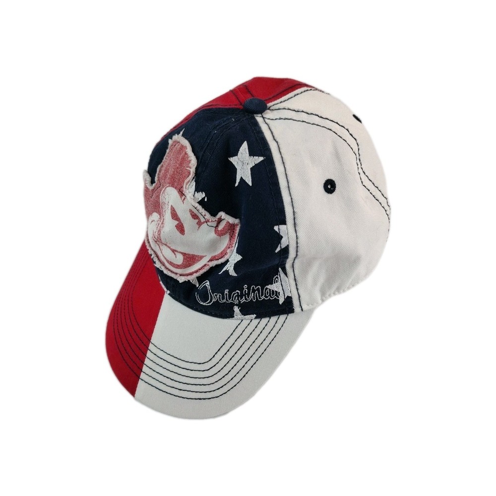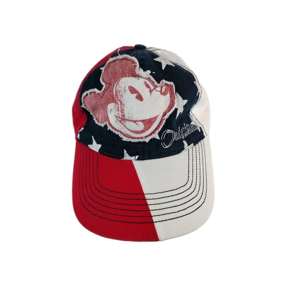 The product is a vintage Walt Disney World Stars and Stripes cap featuring Mickey Mouse, suitable for adult unisex wear. The multicolor design includes the iconic red, white, and blue stars and stripes, embodying the theme of patriotic pride. This adjustable cap is a collectible piece from the Disney franchise, perfect for fans looking to showcase their love for Disney and American heritage.