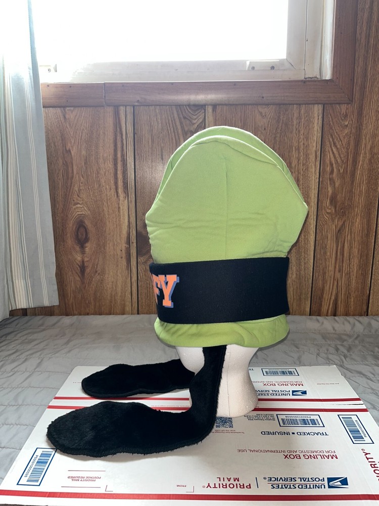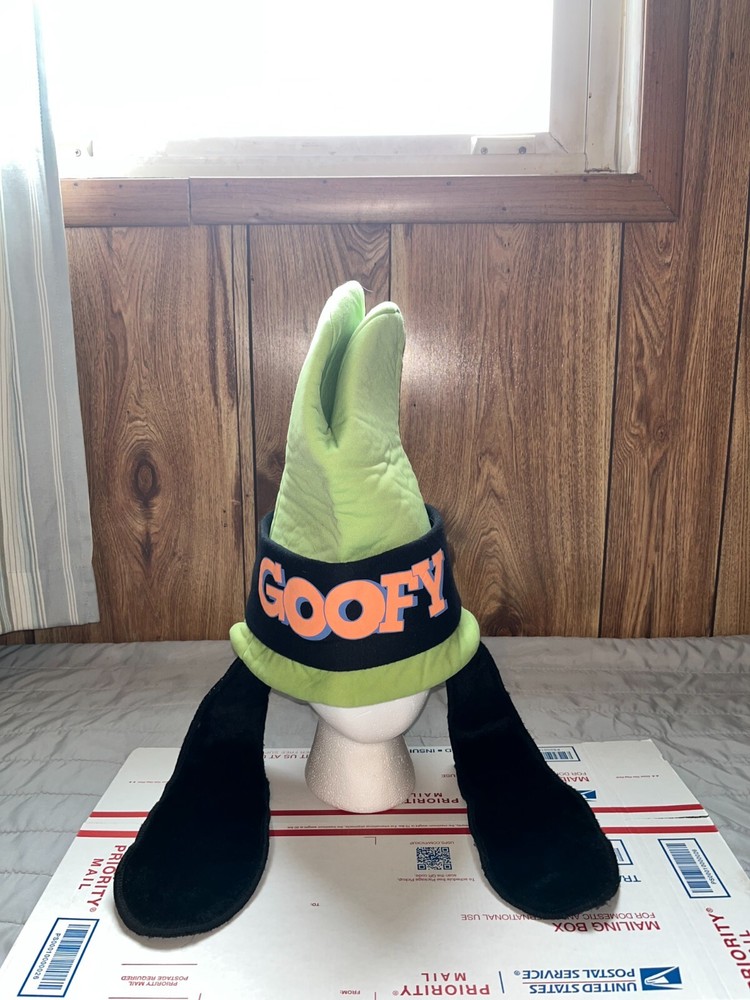 The product is a Walt Disney World hat featuring Goofy, with fuzzy floppy ears, in green color. It is designed for adults, one size fits all, and is suitable for both men and women. The hat is part of the Disney franchise and likely sold at Disney Parks.