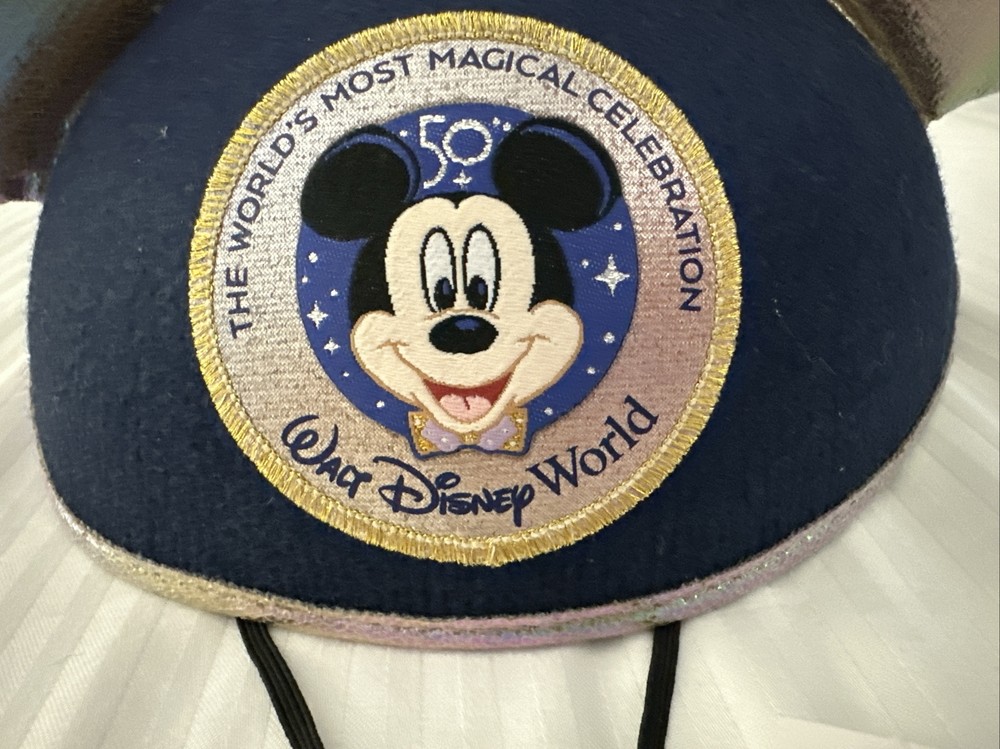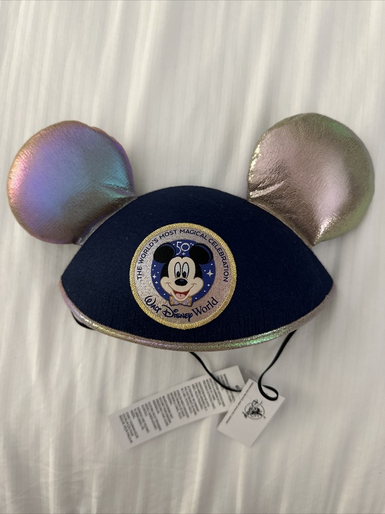The product is a Walt Disney World Mickey Mouse ears hat cap. The hat is a collectible item and falls under the Disneyana category. The hat is adorned with iridescent colors and features Mickey Mouse as the character/theme. It is an apparel and accessory item that can be worn as a hat.