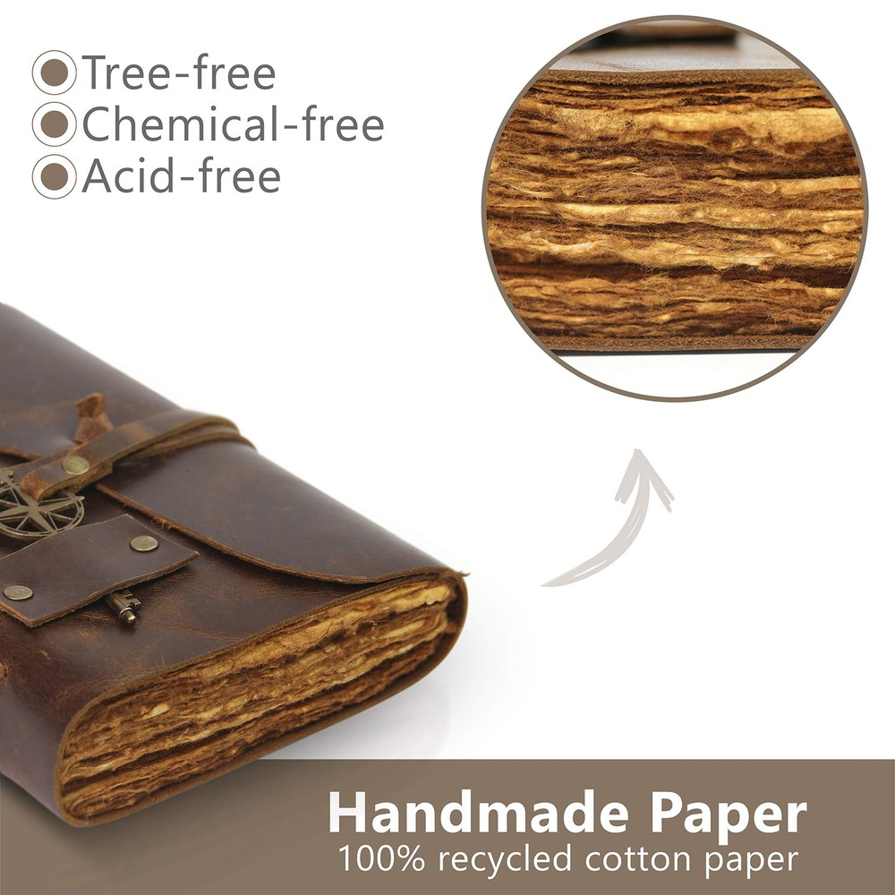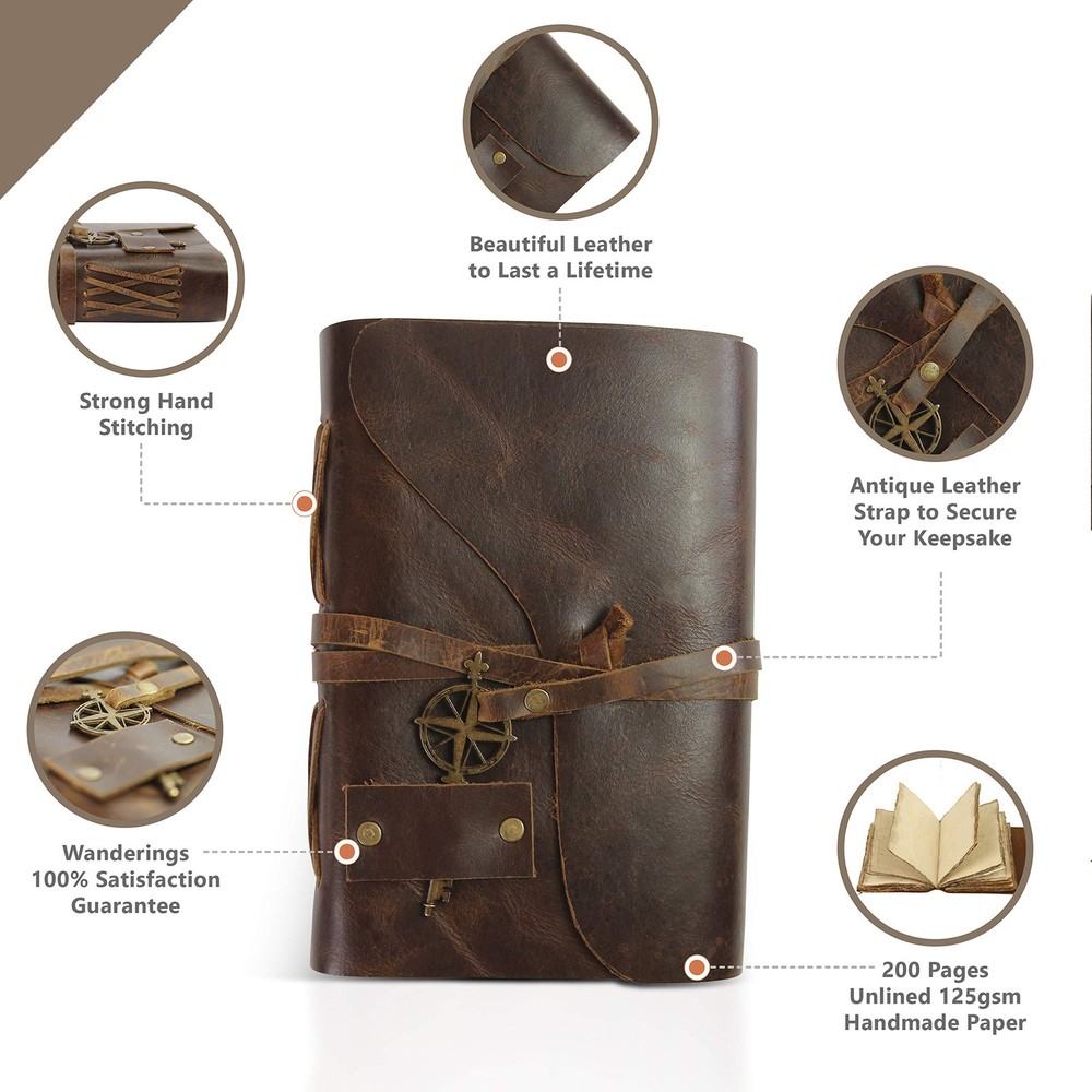 [Beautifully Handcrafted] High quality, thick, full grain 100% leather notebook that looks, smells and feels beautiful. Vegetable tanned buffalo leather will age with character - A lifelong keepsake for your thoughts and expressions [Deckle Edge Vintage Paper] 200 pages of off-white, 130GSM recycled cotton that is acid-free, chemical-free and tree-free. This gorgeous, thick, blank, unlined paper, prevents bleed-through and feels amazing. Environmentally sensitive and fountain pen friendly [Large Size] Escape with your Wanderings leather bound journal and create your own adventure. Makes a great leather writing notebook, sketch notebook, or watercolor pad. Write, dream, draw, or paint - create your own story. Large 8.5x11"/ 21x30 cm and 200 sheets / 100 pages (non-refillable) is the perfect large leather sketch diary and makes a great keepsake [Stylishly Ancient] Old fashioned cotton paper combined with the beauty of a distressed leather , hand stitched by Artisans, creates a keepsake you will cherish forever. Makes a great gift for the men, women, and wiccans in your life! Also available on Amazon in 6x9 size (B08P3MY1QW)