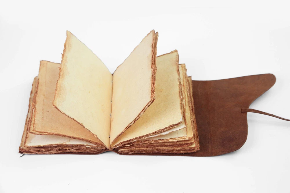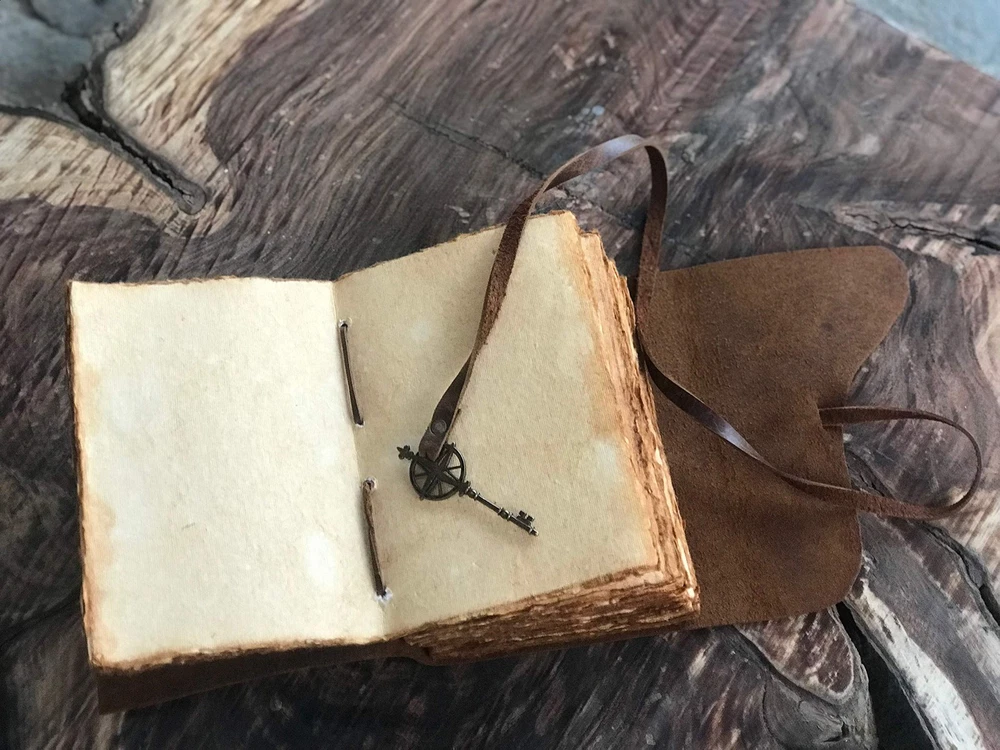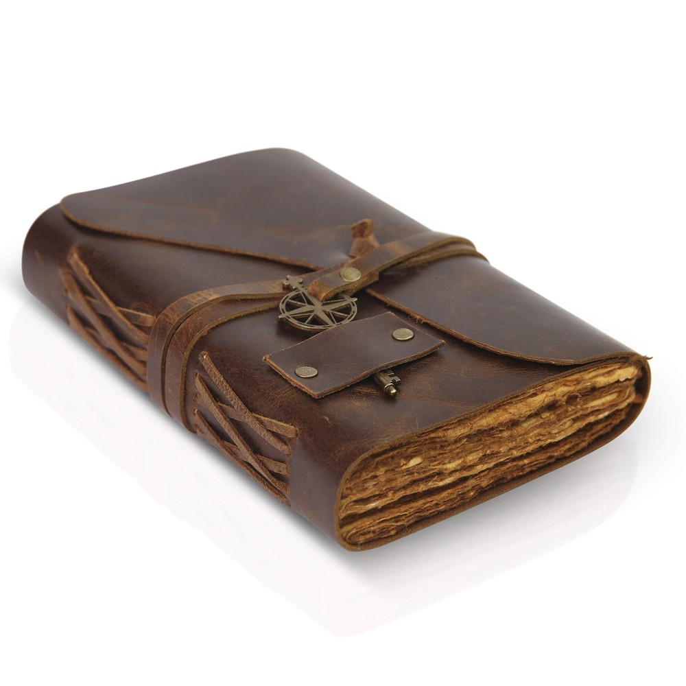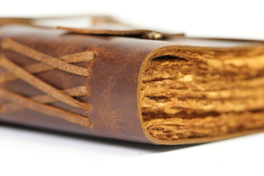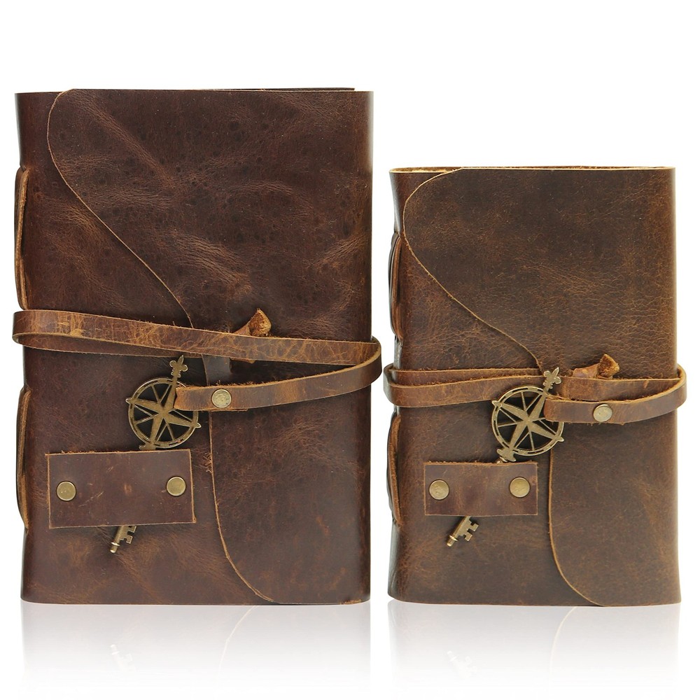 [Beautifully Handcrafted] High quality, thick, full grain 100% leather notebook that looks, smells and feels beautiful. Vegetable tanned buffalo leather will age with character - A lifelong keepsake for your thoughts and expressions [Antique Deckle Edge] 200 pages of 125GSM vintage blank recycled cotton that is acid-free, chemical-free and tree-free. This gorgeous, thick antiqued paper prevents bleed-through and feels amazing. Environmentally sensitive and fountain pen friendly [Free your Imagination] Escape with your Wanderings vintage journal and create your own adventure. Write, dream, sketch, cast a spell - create your own story or your own leather journal of shadows. 7x 5"/ 18x13 cm and 100 sheets / 200 pages (non-refillable) is the perfect size vintage notebook and a great travel companion [Stylishly Ancient] Antique cotton paper combined with the beauty of distressed leather, hand stitched by Artisans, creates a keepsake you will cherish forever. Makes a great gift for the men, women, and wiccans in your life! Also available on in Lined (B09752WV11), Burnt Pages (B0979Y2S5V), and Gift Box (B07YSXV53C)