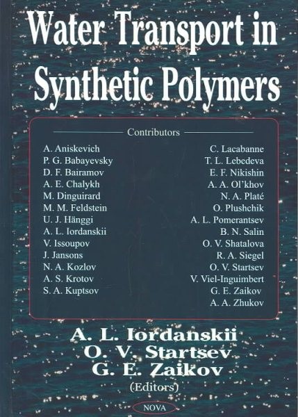 Water Transport in Synthetic Polymers, Hardcover by Iordanskii, A. L. (EDT); Startsev, O. V. (EDT); Zaikov, Gennadii Efremovich (EDT), ISBN 1590338863, ISBN-13 9781590338865, Like New Used, Free shipping in the US Iordanskii (Semenov's Institute of Chemical Physics, RAS, Moscow, Russia) collects the work of Russian and Latvian scientists working on the behavior of water in polymers with different hydrophilicity and morphology, covering academic aspects, experimental procedures and approaches, and practical applications. Some specific topics include modeling of anomal diffusion with fitter software, the molecular arrangement of water associated with poly( N -vinyl pyrrolidone) in the first hydrate shell, moisture sorption and its effect on mechanical properties of polymer materials, and the properties and structure of polymeric composite materials obtained from wood hydrolyzed by the method of steam blasting. Annotation Β©2004 Book News, Inc., Portland, OR ()