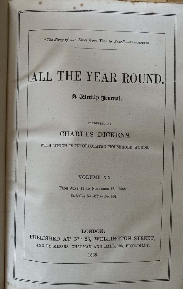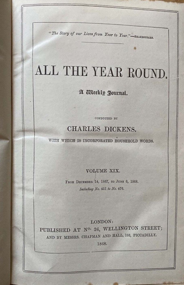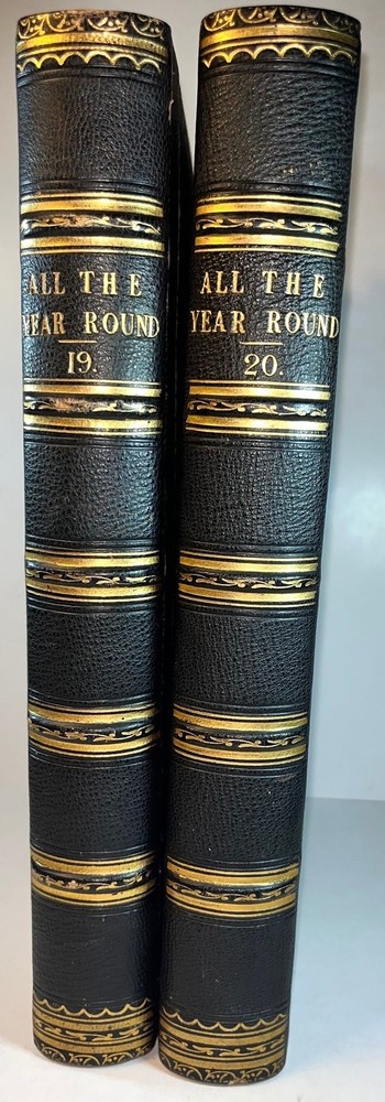 The Moonstone - Complete in "All The Year Round: A Weekly Journal" Volumes XIX & XX Author: Collins, Wilkie Title: The Moonstone - Complete in "All The Year Round: A Weekly Journal" Volumes XIX & XX Publication: London: Chapman and Hall, 1868 Edition: 1st Edition Description: Quarter Leather. Very Good/Near Fine. Two Volumes, 4to. Vol XIX, Issue #451-to #476, December 14, 1867 to June 6, 1868, iv,620pp; Volume XX, Issue #477 to #501, June13, 1868, to November 28, 1868, iv,596pp. Beautifully bound in quarter calf over charcoal cloth covered boards. Titles in gilt on spine with gild bordered compartments and raised bands. t.e.g. Both volumes are square, tight and clean throughout save a few scattered spots on prelims only and very light. Clean, supple pages. Light spotting to fore-edges. Mild rubbing to hinges, corners and surfaces. Very well-preserved. The first appearance of this iconic tale of a stolen precious jewel was serialized in this journal founded and edited by Charles Dickens. Arguably the true first mystery to feature a police detective. A very pretty collectable set at a great price. (Hubin, p.88; Gasson, p.106-107). Seller ID: 012189 Subject: Fine Binding/Decorative, Literature, Mystery/Suspense/Crime Drama 35 Plus years buying and selling collectable books. Member ABAA, ILAB, IOBA. An eclectic mix of good books specializing in Sci-Fi, Mystery, General Antiquarian, Books About Books, Signed First Editions, Vintage Paperbacks, Modern Fiction and many, many others. Prompt, professional customer service, always! Please excuse any glare or reflections in the pictures. Books I know; photography not so much. I will answer any questions regarding condition if pictures are unclear. All books are stored in a temperature controlled library in a smoke free home. All books are professionally packed and shipped and all jacketed books will come with an archival Brodart jacket protector. Thank you for looking. Terms All orders ship within one business day. Standard mail is USPS Media Mail. We offer combined shipping on multiple orders. All items are guaranteed to be as described or they may be returned within 30 days of receipt for a full refund. This listing was created by Bibliopolis.