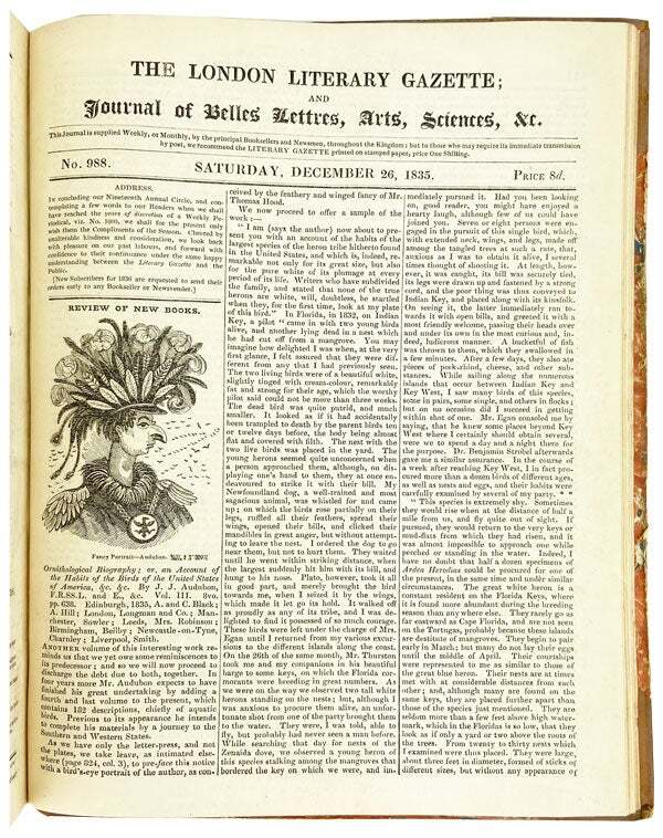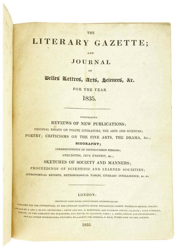 The Literary Gazette; and Journal of Belles Lettres, Arts, Sciences etc. for the year 1835 Author: [William Jerdan [ed.]] Title: The Literary Gazette; and Journal of Belles Lettres, Arts, Sciences etc. for the year 1835 Publication: London: James Moyes, 1835 Description: Very Good. London: James Moyes, 1835. First Edition. Quarto; contemporary calf over marbled boards, gilt-ruled spine; [2],838pp.; woodcut illus., text printed in triple columns. Leather and marbled boards scuffed, lacking spine label, moderate foxing and finger-soil to textblock, else Very Good and sound. Seller ID: 27141 Subject: 19th Century, England / English Writers, Fiction, Journalism / Media, Literary Criticism, Periodicals Capitol Hill Books is a used bookstore located on historic Capitol Hill in Washington DC, with three floors of quality used books, first editions, and rare books. [Note: Our online inventory is stored and managed at a separate location from at our brick and mortar shop. If you have a question about an item listed online, please send a direct message here rather than calling the store so that we can make sure someone familiar with the item in question can respond.] Terms Books described only as First Editions are First Printings unless otherwise specified. All items are guaranteed to be as described or they may be returned within 30 days of receipt for a full refund. All orders ship within two business days. Standard mail is USPS Media Mail. Expedited and international shipping are also available (please contact for estimates). We offer combined shipping on multiple orders. This listing was created by Bibliopolis.