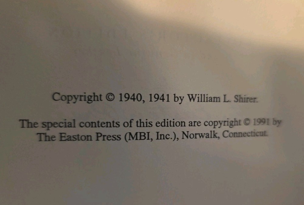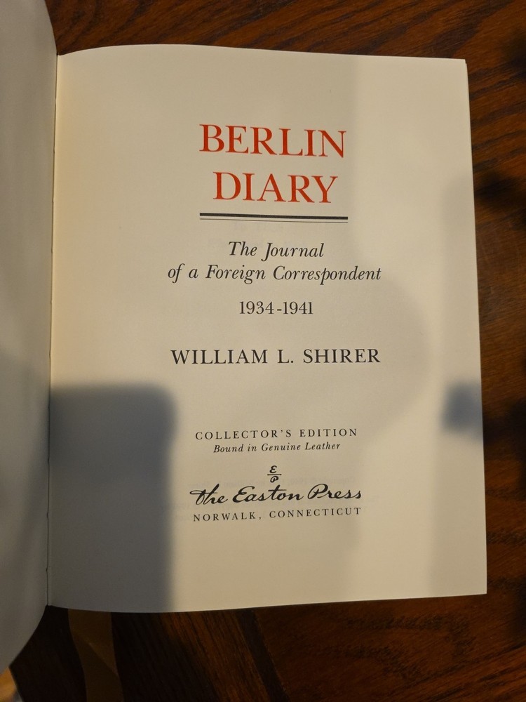 This collectors edition of Berlin Diary is in mint like new condition. The Berlin Diary ("The Journal of a Foreign Correspondent 1934–1941") is a first-hand account of the rise of Nazi Germany and its road to war, as witnessed by the American journalist William L. Shirer. Shirer covered Germany for several years as a radio reporter for CBS. The book is in a genuine leather cover witb gold gliding on it, printed on archival paper with gilded edges. The end sheets are Moire fabric with a silk ribbon page marker. Title: BERLIN DIARY: THE JOURNAL OF A FOREIGN Publisher: Easton Press, Norwalk, Connecticut Publication Date: 1991 Binding: Hardcover Edition: First Edition