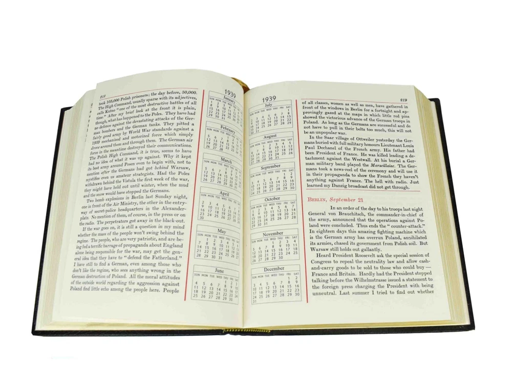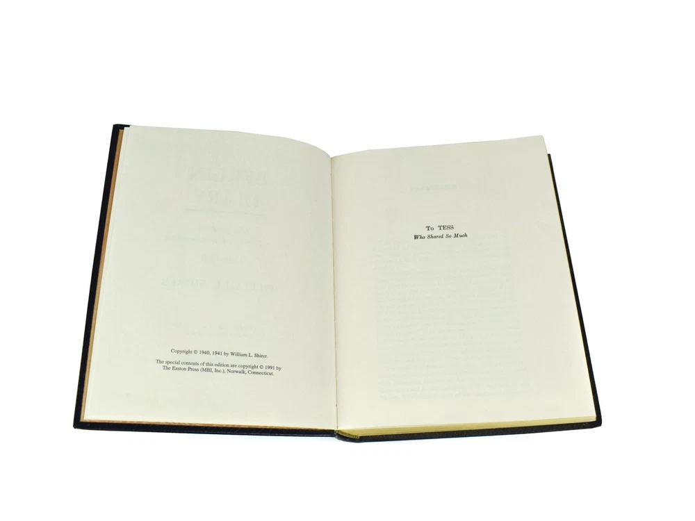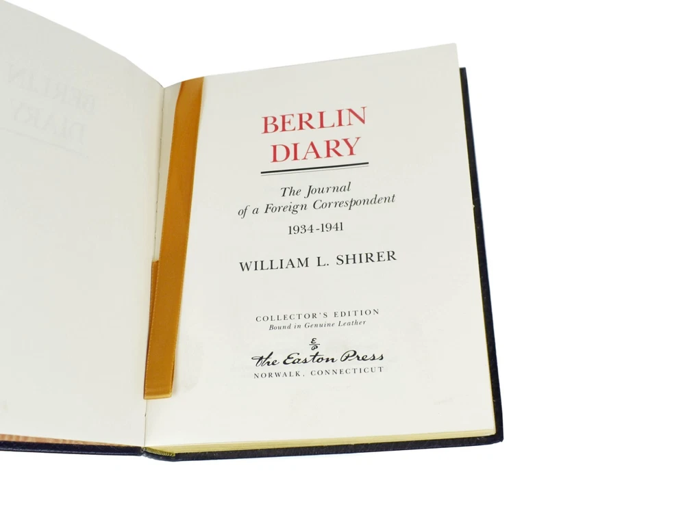 Berlin Diary ("The Journal of a Foreign Correspondent 1934–1941") is a first-hand account of the rise of Nazi Germany and its road to war, as witnessed by the American journalist William L. Shirer. Shirer covered Germany for several years as a radio reporter for CBS. The book has full genuine leather cover gold gliding on it, printed on archival paper with gilded edges. The end sheets are Moire fabric with a silk ribbon page marker. Title: BERLIN DIARY: THE JOURNAL OF A FOREIGN Publisher: Easton Press, Norwalk, Connecticut Publication Date: 1991 Binding: Hardcover Edition: First Edition; First Printing. It is in great condition. Dimensions (approximately): 8.25" L x 6.5" W x 1.75" D 1.15 lbs