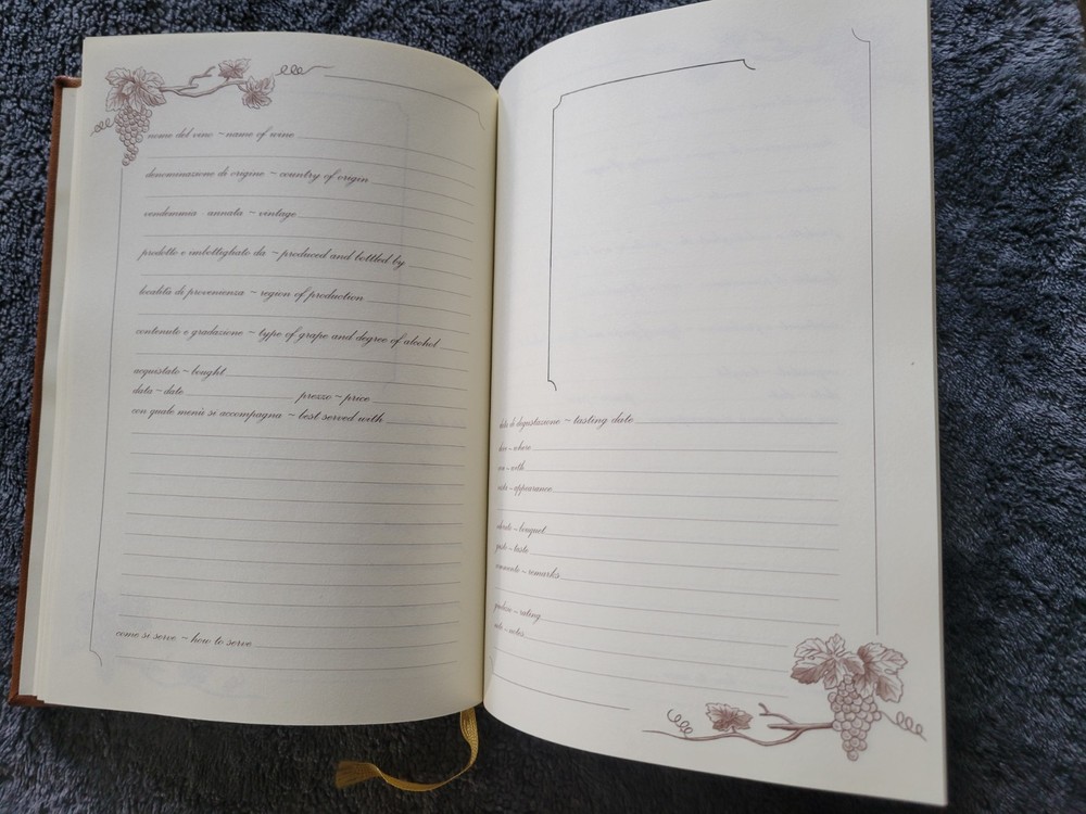 This elegant Italian leather wine journal is a must-have for any wine lover! The worn exterior adds rustic charm, while the clean interior keeps notes organized. The bilingual Italian-English text adds a touch of authenticity, making it perfect for recording tasting notes in style. The rich brown leather feels luxurious, and the compact size makes it easy to carry to vineyards or tastings. A beautifully crafted keepsake for serious connoisseurs.