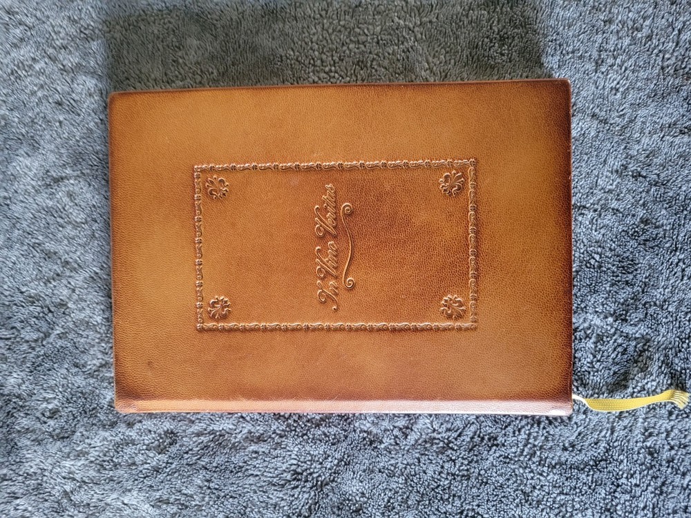 Leather has some wear on outside adding to the charm. Interior is clean and unmarked. Written in Italian with the English translation next to it. Crafted for the connoisseur, the Wine Enthusiast In Vino Veritas Wine Journal is a sophisticated accessory for any wine lover's collection. Made in Italy from high-quality leather, this journal is a seamless blend of luxury and functionality, featuring a rich brown hue that speaks to the earthy tones of a fine wine. Measuring 10 inches in length, 7 inches in width, and 1 inch in height, this wine journal is perfectly sized for intimate tastings or to be displayed prominently on your desk. With its classic design, it's an ideal companion for documenting your wine experiences or for simply appreciating the art of the grape.