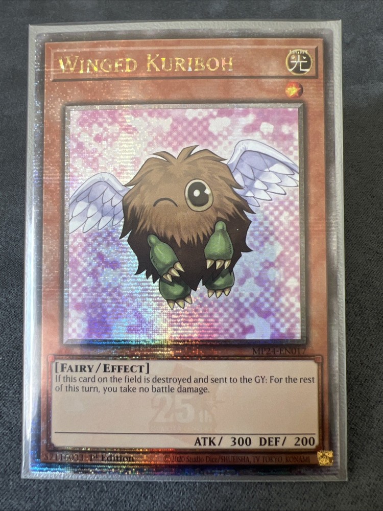 The Winged Kuriboh from the 25th Anniversary Tin: Dueling Mirrors is a rare Yu-Gi-Oh! collectible card game card manufactured by Konami. This first edition card features the fairy creature type with a light attribute, boasting a defense of 200 and an attack power of 300. As a Quarter Century Secret Rare card in near mint condition, it is a valuable addition to any collector's deck. Its English language name, MP24-EN017, and unique design make it a sought-after card for fans of the Yu-Gi-Oh! TCG.