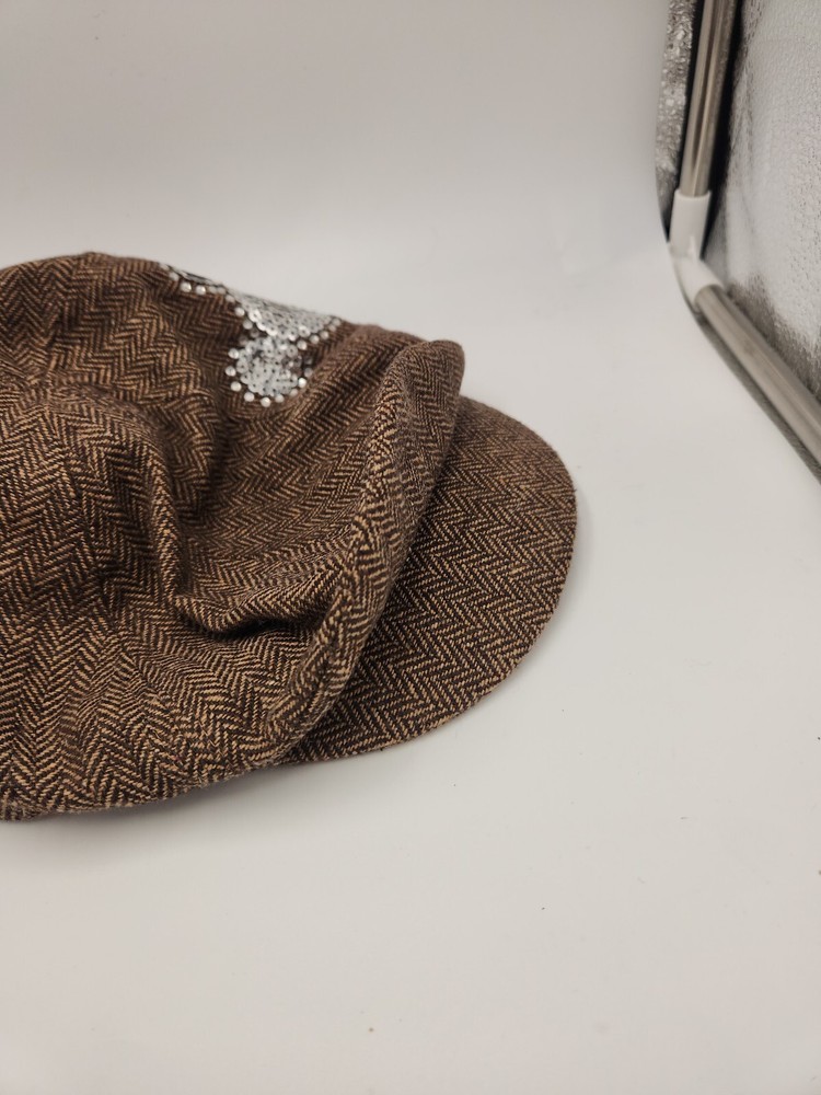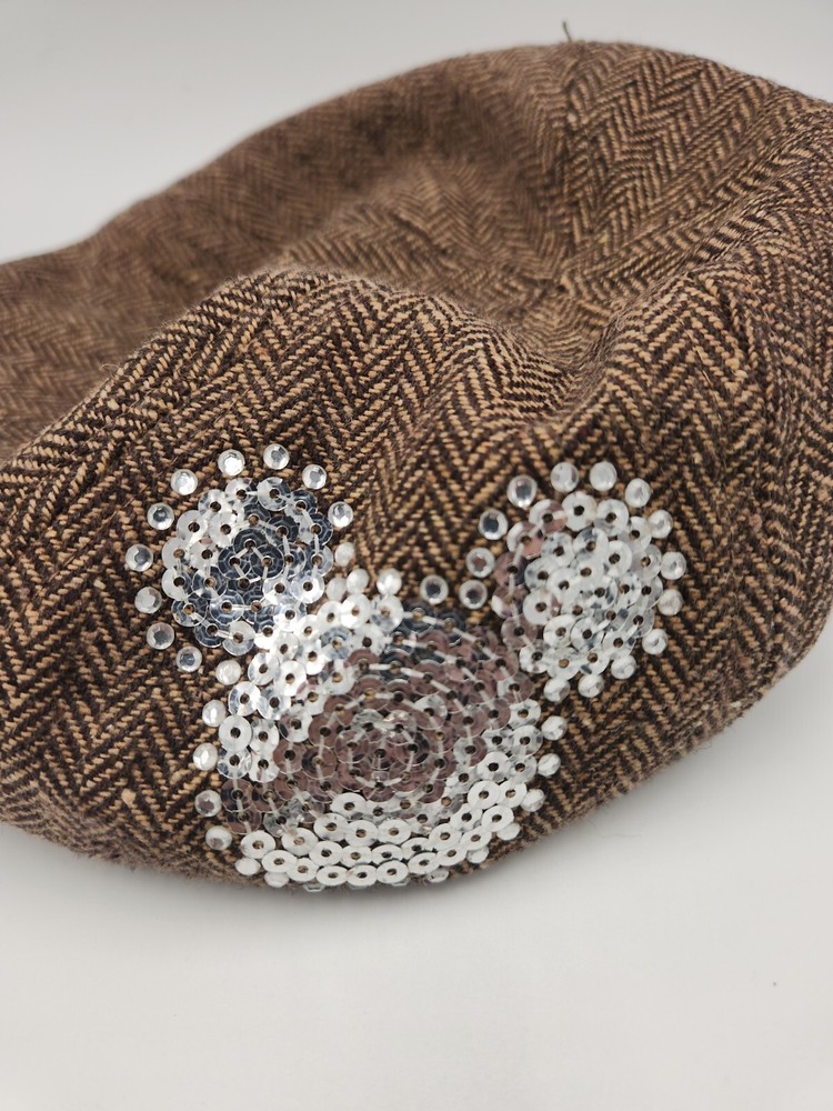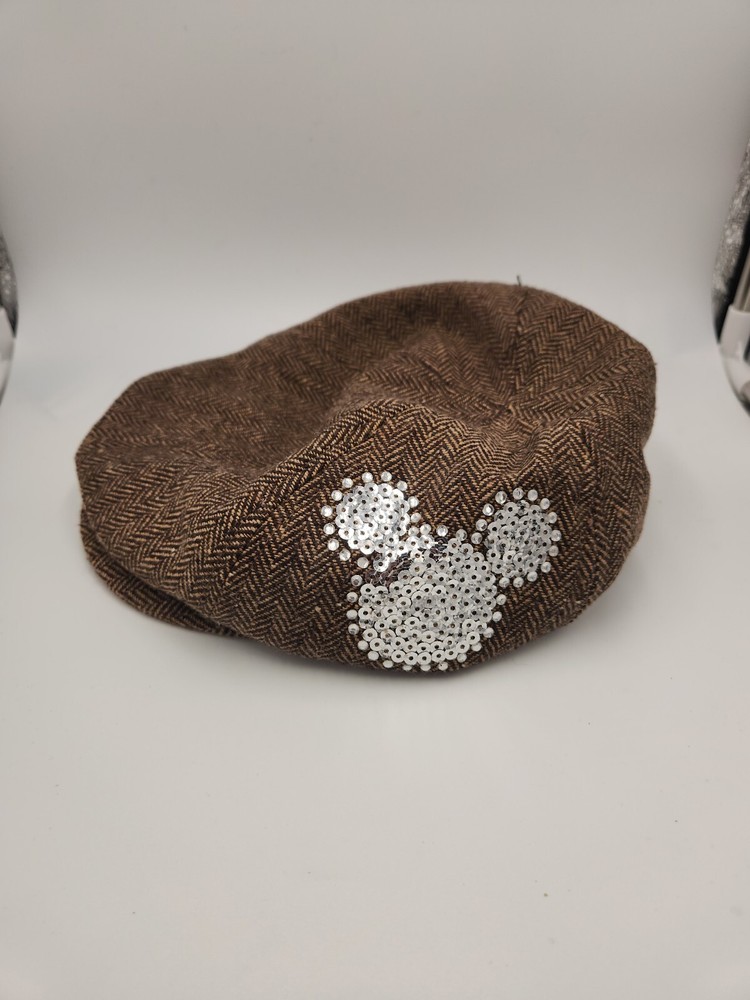 Womens Walt Disney World Brown Tweed Newsboy Cap Hat with Sequin Mickey Mouse....