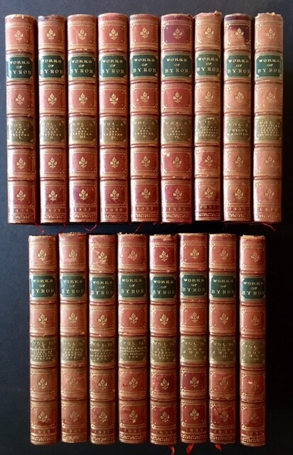The Works of Lord Byron: With His Letters and Journals, and His Life, by Thomas Moore, Esq. (Complete in 17 Vols.) Author: Lord Byron Title: The Works of Lord Byron: With His Letters and Journals, and His Life, by Thomas Moore, Esq. (Complete in 17 Vols.) Publication: London: John Murray, 1832-33. Description: Full leather. An impressive example of this original compilation of the works of Byron, complete in 17 volumes and bound --and signed-- in a full, mid to late 19th century red morocco by Root & Son of London. Each uniform volume has bright gilt-rule at the panels and 5 raised bands along each spine, with fine, decorative gilt-tooling at the compartments and offsetting leather title labels. All of the volumes are at least VG+ (or better) and only 1 or 2 show the lightest of wear along the spines and just a touch of staining at the panel edges. There's a bit of forgivable foxing at the endsheets but each volume is free of bookplates or writing or any other markings to the text. Each volume also includes a wonderful engraved title-page (all different engravings, each by E. Finden) which PRECEDES the printed title-page. 16mos, top-edges gilt, lovely marbled endpapers. Very Good +. Seller ID: 13810 Subject: Literature Appledore Books Waccabuc, NY We offer an eclectic selection, specializing in childrens, art, photography, literature, history, chess, sports and more. Guarantee We are members of the Antiquarian Booksellers' Association of America (ABAA) and we stand behind what we offer for sale. Any item may be returned for any reason within 30 days of receipt. Shipping All books shipped to US destinations are sent US Post Office Media Mail. Delivery typically takes a week, but may be longer, especially during the holidays. Faster shipping is available, please contact us for a price quote. We will combine shipping on items purchased at the same time. If you check out immediately and are overcharged for shipping during checkout, we will send you a prompt refund, once the actual shipping costs are known. Feedback We leave feedback for buyers once they have posted feedback for us. If you are unhappy with any aspect of a transaction with us, please contact us immediately. We work hard to keep buyers happy and to resolve the rare problem promptly. This listing was created by Bibliopolis.