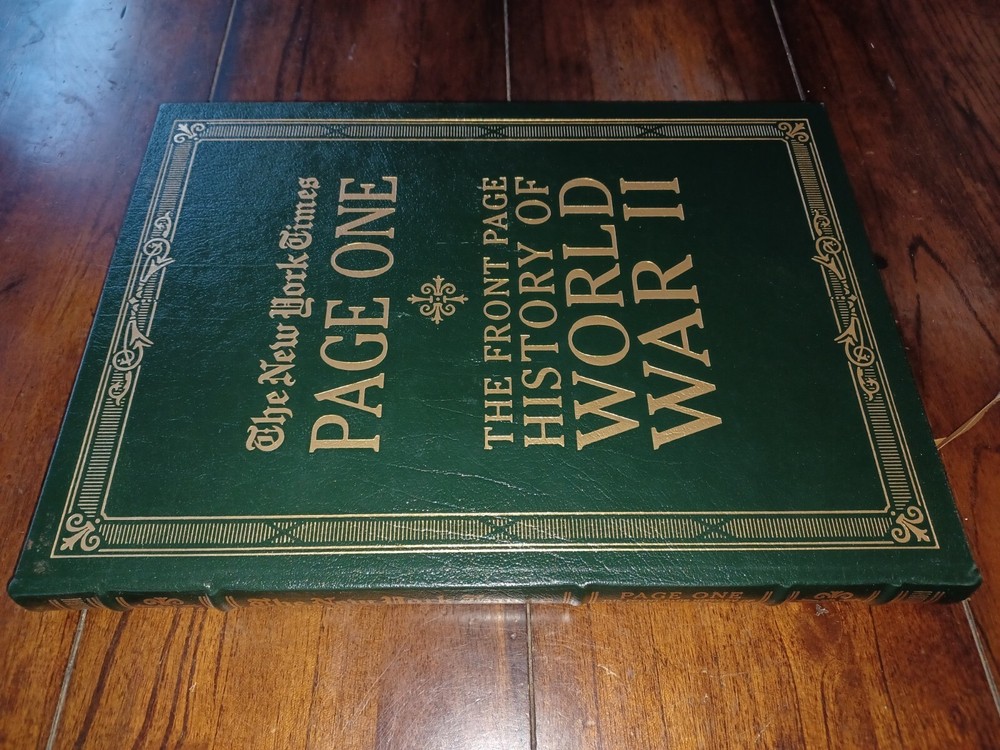No reserve. The New York Times PAGE ONE: The Front Page History of WORLD WAR II. Fully leather bound, oversized hardback published by Easton Press in 2003. 186 numbered pages. Silk end pages. Gilding to all three text block edges, front board, and spine, which also features raised bands. Book ribbon. Not an ex-library book. Edge wear to cover. Spine square, binding solid. Only interior writing is pencil pricing S/H $8.99 media mail in bubble pack envelope; 11.99 in box.