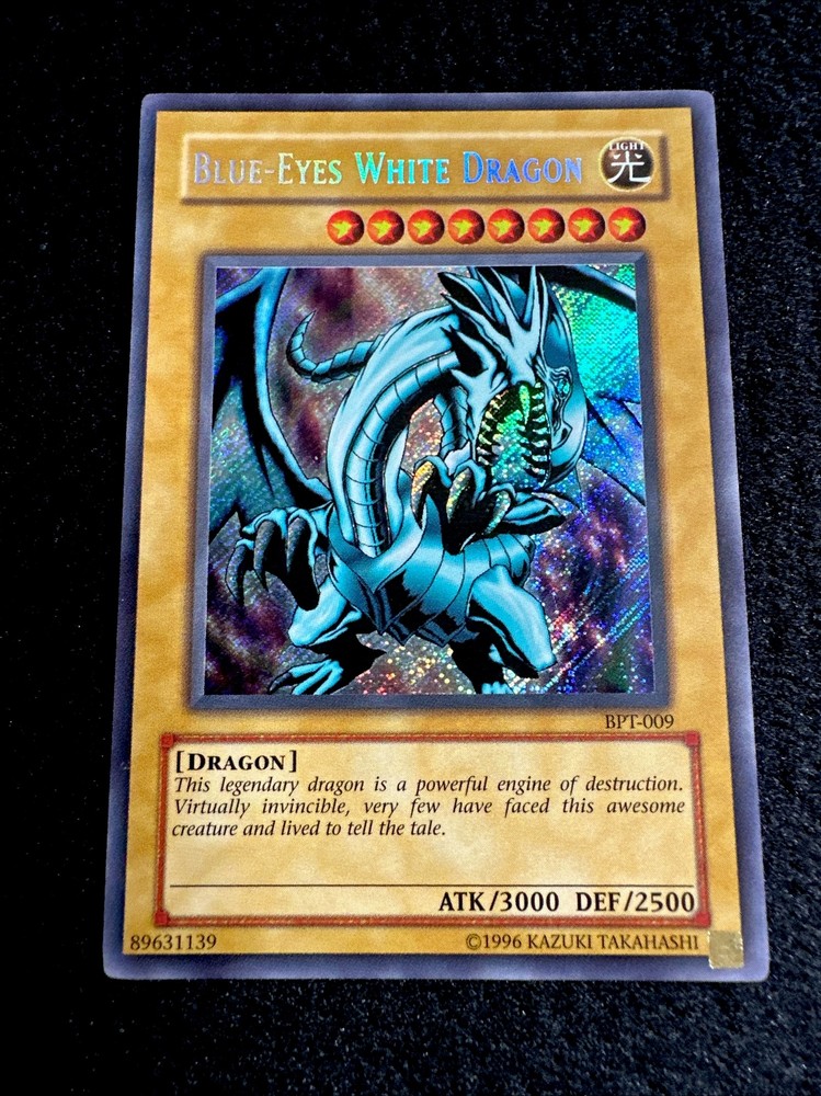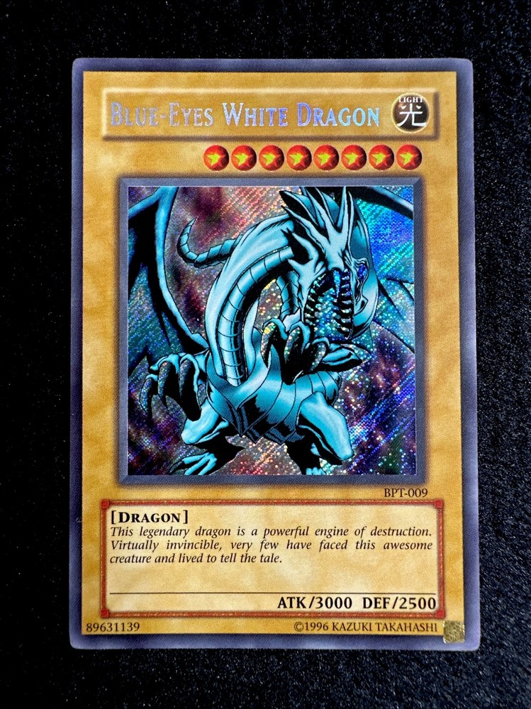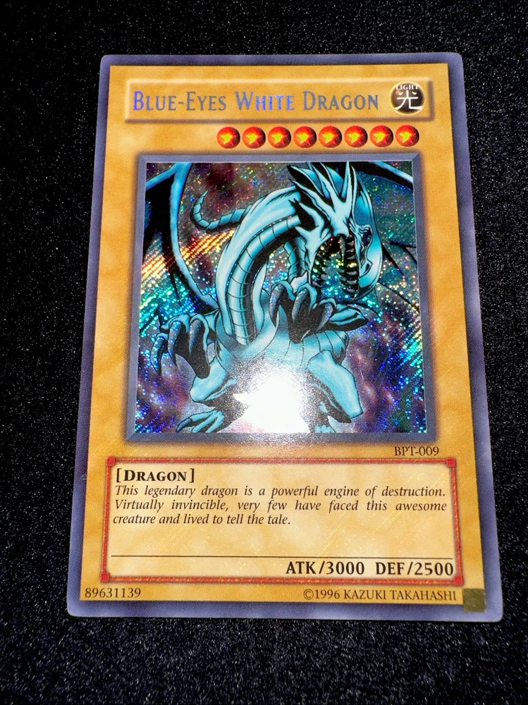 🔥 YUGIOH • BLUE-EYES WHITE DRAGON • SECRET RARE • BPT-009 • PROMO • VLP 🔥 Card Sleeve Included + Top Loader • VERY LIGHTLY PLAY CARD • Authentic Konami USA Version YOU ARE GUARANTEED TO GET THE CARD NAMED IN THE TITLE. Thank you.
