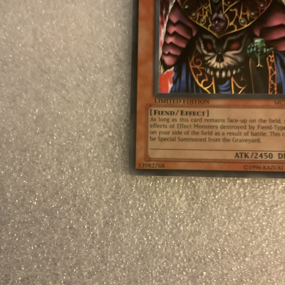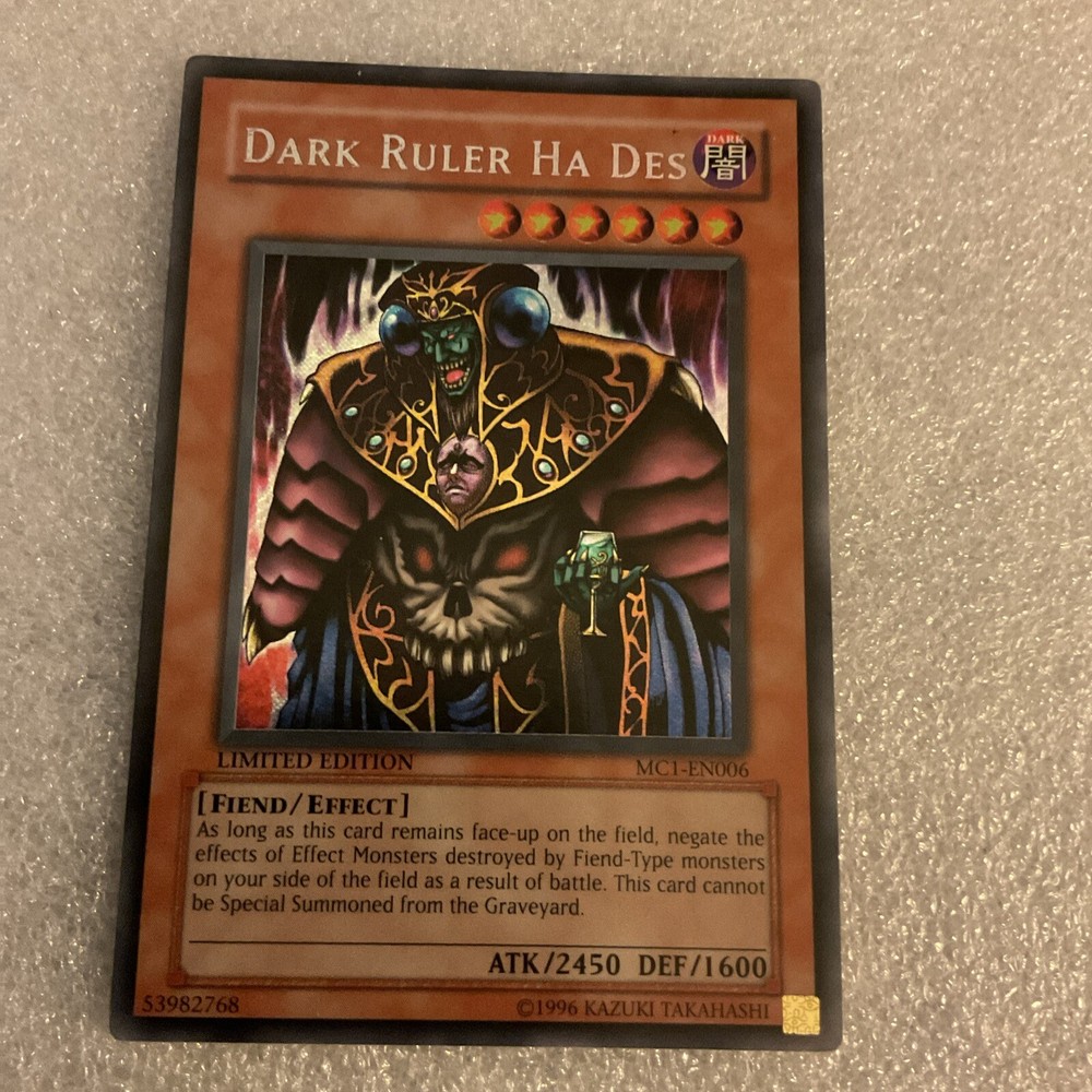 This limited edition Yu-Gi-Oh! TCG card features Dark Ruler Ha Des, a powerful Fiend monster belonging to Yugi Muto. With a Japanese card size, Secret Rare rarity, and Holo finish, this Collector's Tin Promo card is a must-have for any fan or collector. The card number for this Konami-manufactured card is MC1-EN006, and it boasts an impressive Effect card type. The card is in near mint condition, ready to be added to your deck or put on display. Don't miss out on the chance to own this stunning Dark Ruler Ha Des card.
