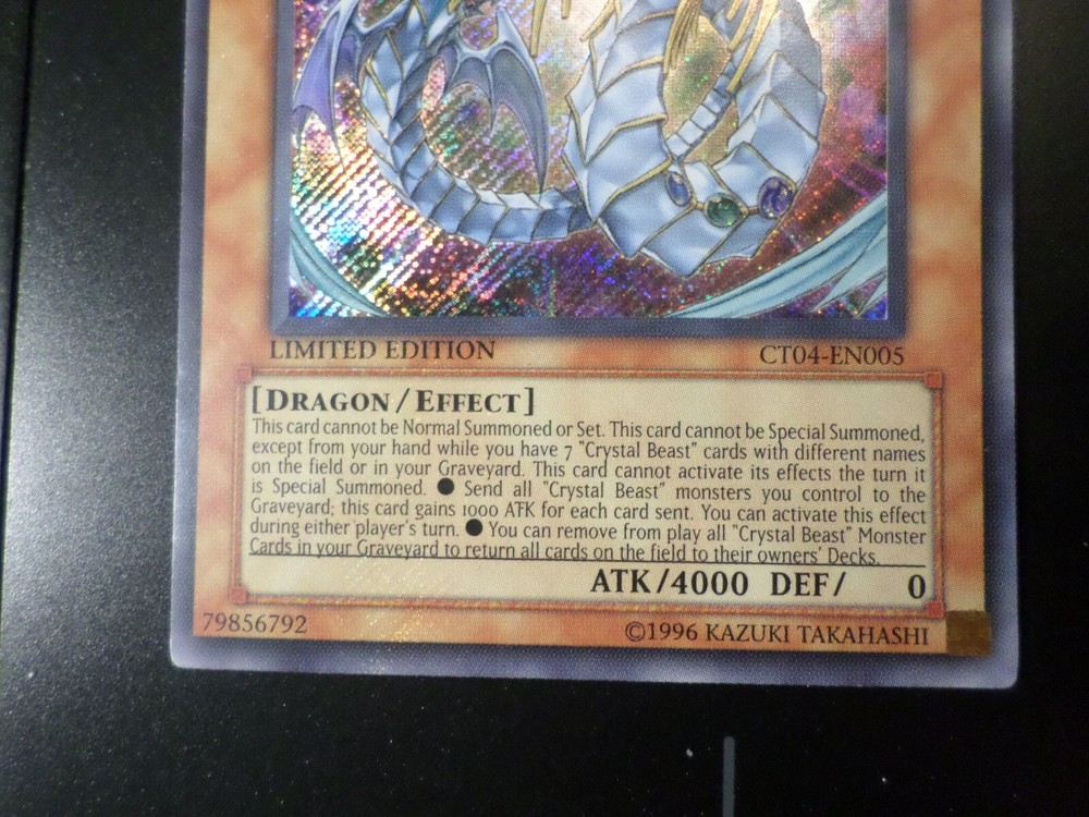This listing is for ONE YUGIOH RAINBOW DRAGON CT04-EN005 LIMITED EDITION SECRET RARE NM Condition: NM Rarity: SCR - Secret Rare UR- Ultra Rare SR - Super Rare ULT - Ultimate Rare Near Mint (NM) Excellent to close to mint. Excellent (EX) Card may have minor edge wear / small dents more due to handling than to play. Lightly Played (LP) Card may have edge wear and/or small dents, but no major creases. Moderately Played (MP) Card may have visible creases, dents and/or edge wear. Heavily played (HP) Card will have noticeably damage such as large creases and/or heavy edge wear. Note: If edition of card(s) is not mentioned, it is for unlimited edition. Card(s) will be shipped with protective sleeve and in top loader Please note I am just a private collector, not a professional cards grader. Cards conditions are judged based on my personal opinions. Since I don’t price them based on professional standards in the market, please allow room for discrepancies. To ensure that your satisfaction is met with the highest standard, I usually pictured with actual card(s) – front and back unless there are multiple copies of the same card listed. Please feel free to contact me prior purchase if want to see more pictures or understand better of the card(s) conditions. All cards are guaranteed authentic. I don't take return unless item was incorrectly described/ reason due to my mistakes. I will try my best to rectify any problems or answer any questions that you may have. Please check your address to ensure it is complete and deliverable. Serious buyers only. Listing takes time and cost money. Please purchase/make offer when you are ready to pay/upon acceptance of offer. Thank you. ______________________________________________________________ YUGIOH CARDS LISTINGS Shipping & Handling is $2.95 to the U.S. Shipping to Canada is $3.95 and international is $6.95 for as many cards as you can purchase with combined shipment. Customs duties, if any, are for buyer's account. Tracking is not available unless otherwise specified When tracking is not offered, please strictly follow information in my shipment confirmation about expected arrival time or waiting period for claims. Please allow sufficient time for item(s) delivery and contact me first prior to opening any claims. I will provide proof of shipment upon request and money back guarantee if item doesn't show up after the waiting period. Thank you and appreciate your co-operation. Track Page Views With Auctiva's Counter