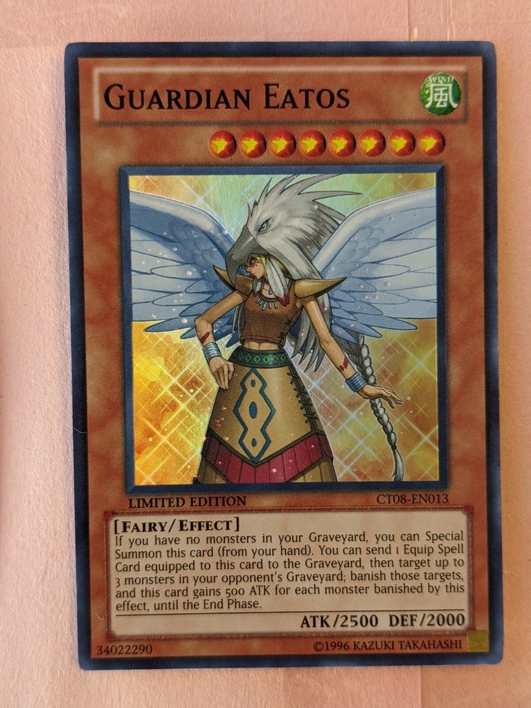 You are bidding on a YUGIOH-GUARDIAN EATOS-SUPER RARE LIMITED EDITION-CT08-EN013 This card is not graded but in good condition. This card may have been played with. There are slight marks seen from certain angles. You get the card shown in the pictures. I will ship your card in a top loader, bubble wrap then cardboard mailer. I will combine shipping. My shipping price is $2.99 for up to 9 regular thickness cards and $3.99 and up for anything over 10 cards. Payment must be made within 3 days of purchase. I will ship 2 business days after receiving payment. I don't ship on Saturday or Sundays. To ALL my customers, please be patient as the mail has slowed down due to the VIRUS. THANK YOU for your patience and understanding. Be safe!! There is a delay at customs, my US customers, please note it could take up to 60 days to receive your cards. If you have any questions, please don't hesitate to contact me. Please check out my other items at Jethro's cards and collectibles. Have a great day, cheers!