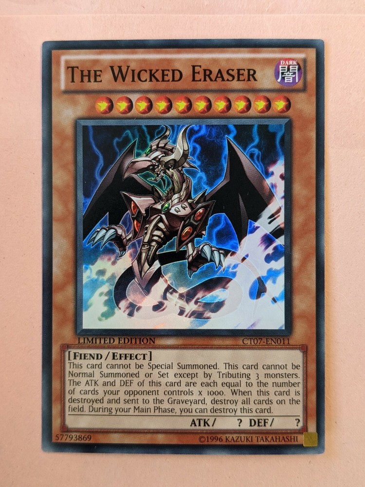 You are bidding on a YUGIOH-THE WICKED ERASER-SUPER RARE LIMITED EDITION-CT07-EN011 This card is not graded but in good condition. This card may have been played with. There are slight marks seen from certain angles. You get the card shown in the pictures. I will ship your card in a top loader, bubble wrap then cardboard mailer. I will combine shipping. My shipping price is $2.99 for up to 9 regular thickness cards and $3.99 and up for anything over 10 cards. Payment must be made within 3 days of purchase. I will ship 2 business days after receiving payment. I don't ship on Saturday or Sundays. To ALL my customers, please be patient as the mail has slowed down due to the VIRUS. THANK YOU for your patience and understanding. Be safe!! There is a delay at customs, my US customers, please note it could take up to 60 days to receive your cards. If you have any questions, please don't hesitate to contact me. Please check out my other items at Jethro's cards and collectibles. Have a great day, cheers!