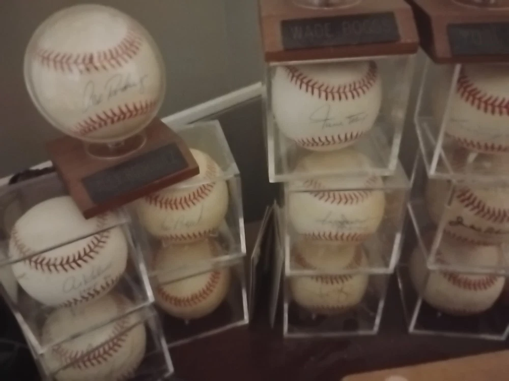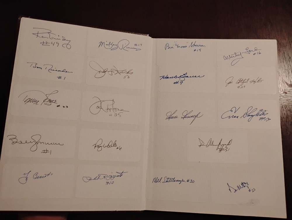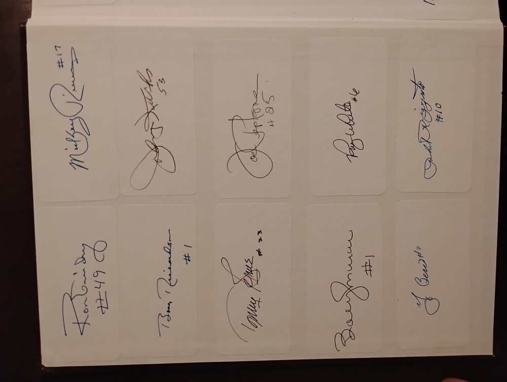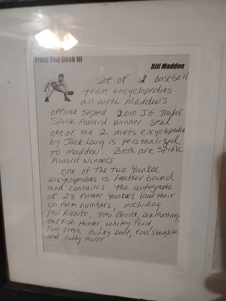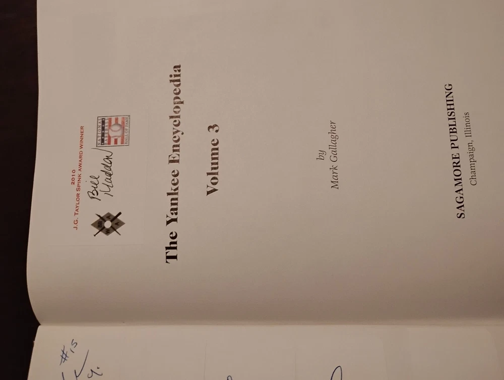 For sale from the collection of sportswriter and Hall Of Fame inductee Bill Madden is a leather bound Yankees Encyclopedia Volume 3, 1987 edition signed by 29 Yankees and HOFers. Winner of the 2010 J.G. Taylor Spink Award, HOF inductee, MLB and NY Yankees sportswriter, best selling author of "Steinbrenner" and author of other sports books. The personal collection of Madden has autographs acquired by him during his HOF induction in 1987 as stated by him in a letter of provenance written from the personal notepad of his New York Daily Post desk and provided photos. The encyclopedia is autographed by Madden himself on his J.G. Taylor Spink Award media sticker and has autographs from Yankee greats like Yogi Berra, Enos Slaughter, Catfish Hunter, Don Mattingly, Whitey Ford, Buckey Dent, Tom Tresh, Phil Rizzuto, Ron Guidrey, Bobby Murer, Goose Gossage, Joe Peppitone, Mel Stottlemeyer, Luis Arroyo, Hank Bauer and more. The book will be acxompanied by the letters of provenance from Bill himself and can easily be verified for authentication through JSA or any other professional authentication organization. There are also personal newspaper clippings from Madden inside. Not for sale in this auction are 13 autographed baseballs by HOF Yankee players that will also be for sale. Autographs/signatures on game used American League MLB baseballs by Willie Mays, Wade Boggs, Al Kaline, Alex Rodriguez, Yogi Berra, Carl Yastrzemski, Lou Brock, Harmon Killabrew, Reggie Jackson, Louis Apparicio, Jason Giambi, Willie McCovey and a Frank Robinson commemorative baseball with a facsimile signature.I also have a Willie Mays signed plaque, Greg Nettles signed historic photograph from NY Post Vault with stamp of authentication from Nettles stretch out catch made at 3rd base during the World Series in 1965. I have many other historical autographed MLB and NFL items which I will be adding to this site. Keep watching and I hope you enjoy.