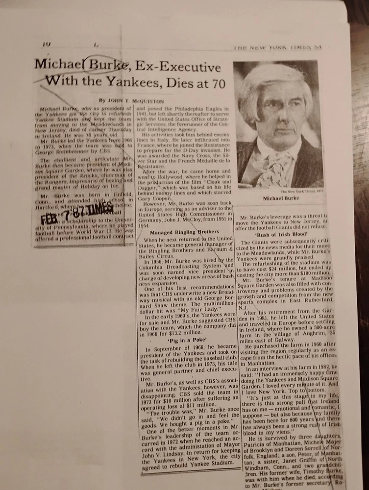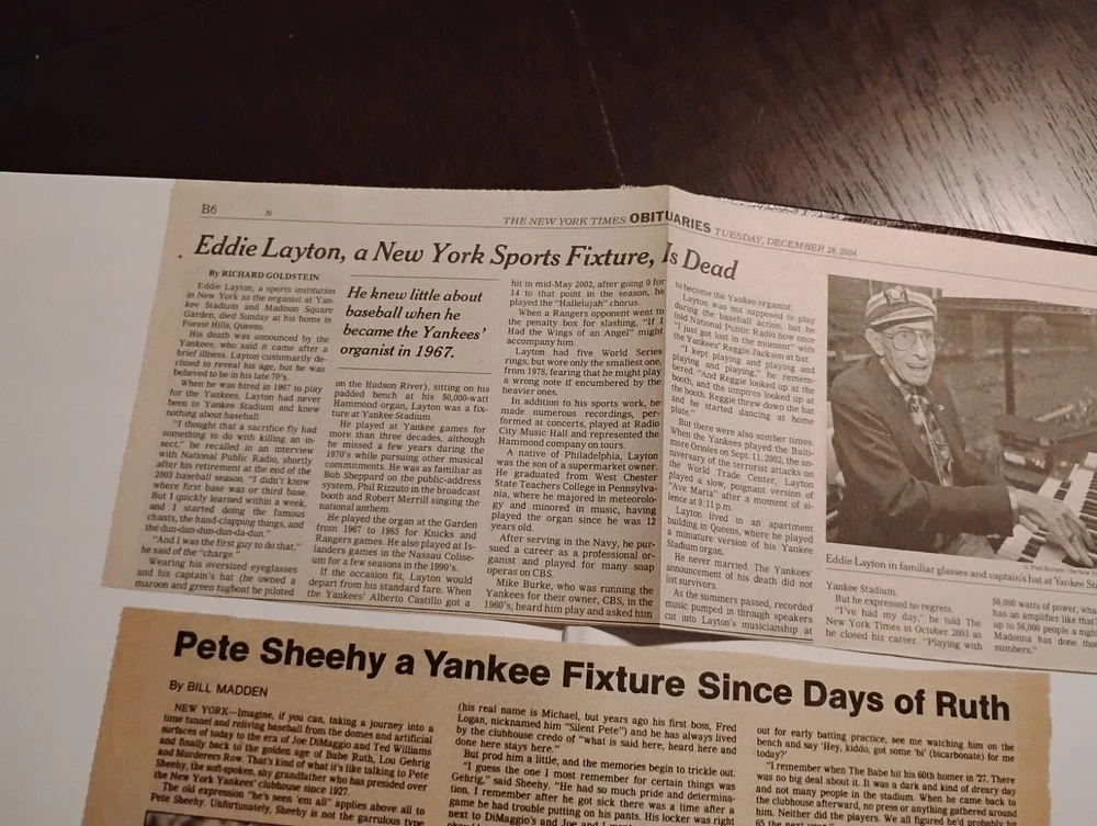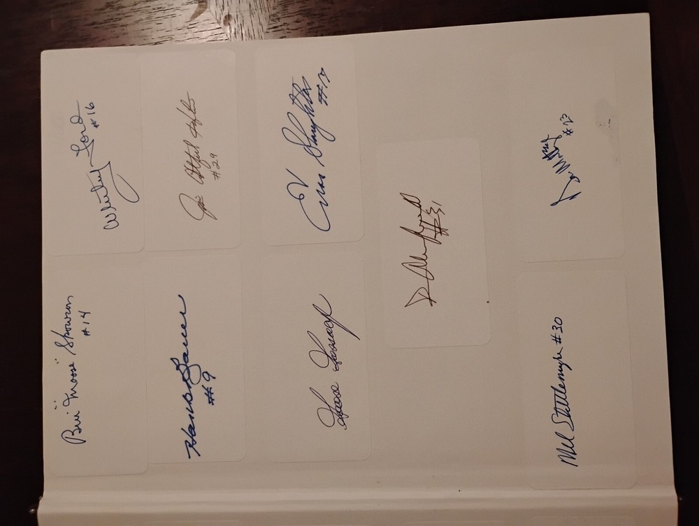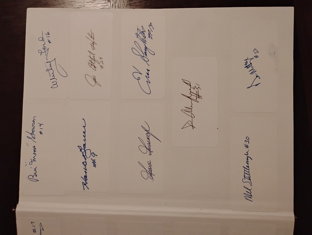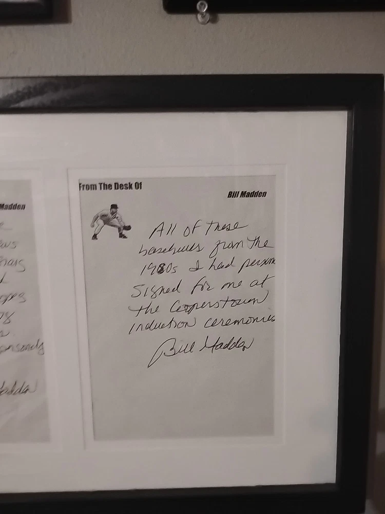 For sale from the collection of sportswriter and Hall Of Fame inductee Bill Madden is a leather bound Yankees Encyclopedia Volume 3, 1987 edition signed by 29 Yankees and HOFers. Winner of the 2010 J.G. Taylor Spink Award, HOF inductee, MLB and NY Yankees sportswriter, best selling author of "Steinbrenner" and author of other sports books. The personal collection of Madden has autographs acquired by him during his HOF induction in 1987 as stated by him in a letter of provenance written from the personal notepad of his New York Daily Post desk and provided photos. The encyclopedia is autographed by Madden himself on his J.G. Taylor Spink Award media sticker and has autographs from Yankee greats like Yogi Berra, Enos Slaughter, Catfish Hunter, Don Mattingly, Whitey Ford, Buckey Dent, Tom Tresh, Phil Rizzuto, Ron Guidrey, Bobby Murer, Goose Gossage, Joe Peppitone, Mel Stottlemeyer, Luis Arroyo, Hank Bauer and more. The book will be acxompanied by the letters of provenance from Bill himself and can easily be verified for authentication through JSA or any other professional authentication organization. There are also personal newspaper clippings from Madden inside. Not for sale in this auction are 13 autographed baseballs by HOF Yankee players that will also be for sale. Autographs/signatures on game used American League MLB baseballs by Willie Mays, Wade Boggs, Al Kaline, Alex Rodriguez, Yogi Berra, Carl Yastrzemski, Lou Brock, Harmon Killabrew, Reggie Jackson, Louis Apparicio, Jason Giambi, Willie McCovey and a Frank Robinson commemorative baseball with a facsimile signature.I also have a Willie Mays signed plaque, Greg Nettles signed historic photograph from NY Post Vault with stamp of authentication from Nettles stretch out catch made at 3rd base during the World Series in 1965. I have many other historical autographed MLB and NFL items which I will be adding to this site. Keep watching and I hope you enjoy.