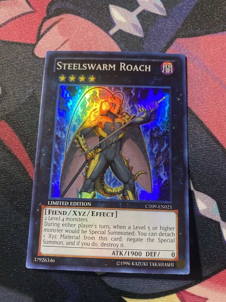 Steelswarm Roach from the 2012 Collectors Tin is a Dark Fiend monster card in the Yu-Gi-Oh! TCG. It has 1900 Attack and its unique effect makes it a Super Rare Limited Edition card. Produced by Konami, this Xyz card (CT09-EN021) is a powerful addition to any player's deck.