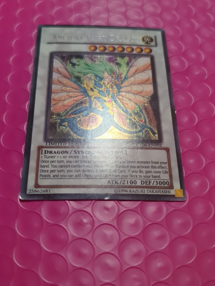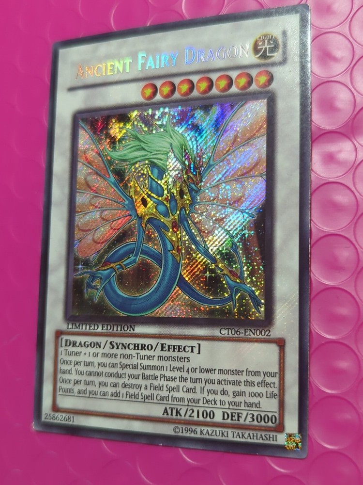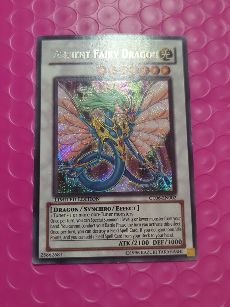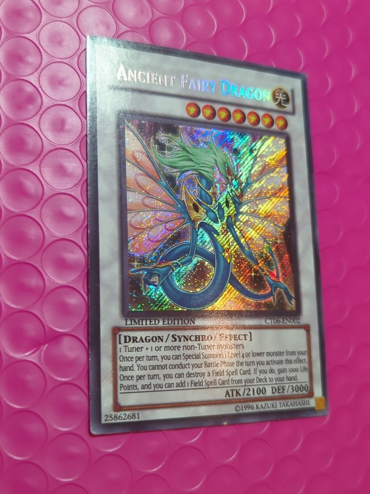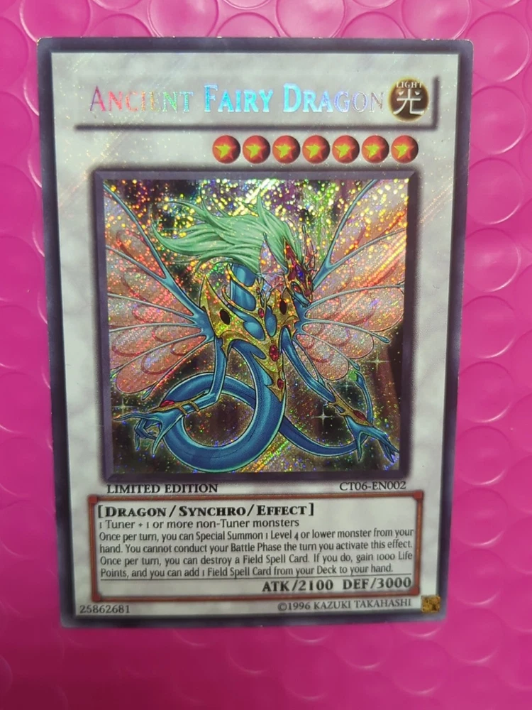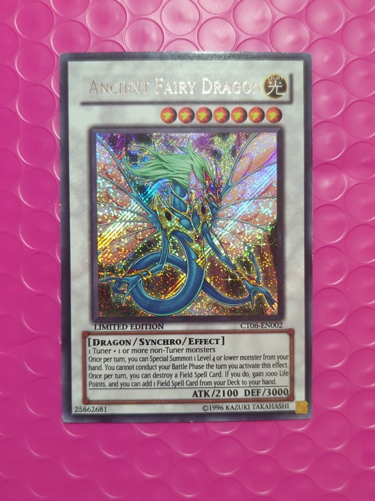 Yu-Gi-Oh! Ancient Fairy Dragon CT06-EN002 Limited Edition NM. The condition of this card is: Near Mint *All cards sold will be inside of a penny sleeve and top load card holder. Packaging will be in a bubble envelope for extra protection.* **In an attempt to empty my collection, every order will come with a gift of additional sleeved cards of various conditions that may fit the theme/archetype (depending on what's remaining in my collection). The bigger the sale, the bigger the gift!**