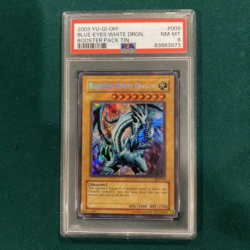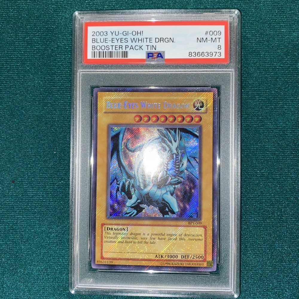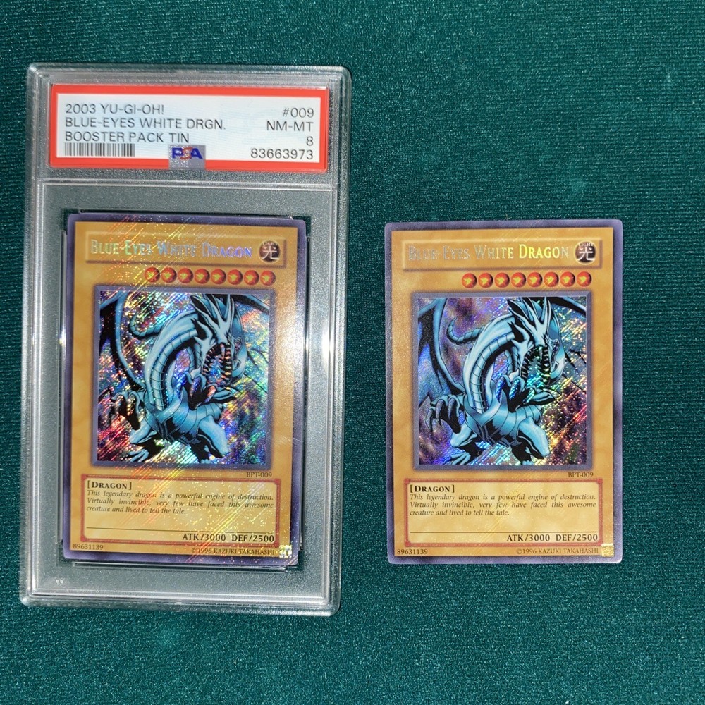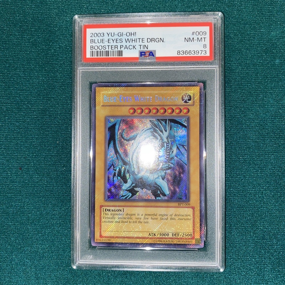 You will receive 1x psa 8 blue-eyes white dragon bpt with heavy foil bleed. Card is absolutely stunning. In one of the picture you can see the difference between this card compares to one with regular holo bleed. This card is probably 1 of a kind. I haven’t seen any blue eyes white dragon bpt with this kind of holo bleed. Get this card before it’s gone.