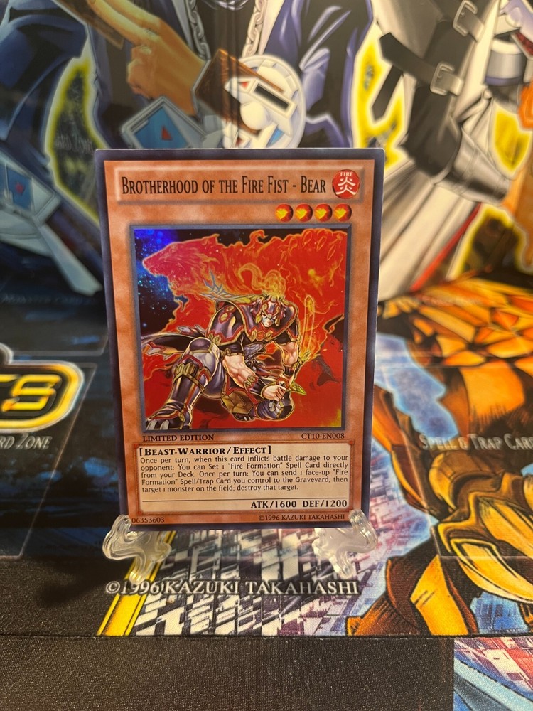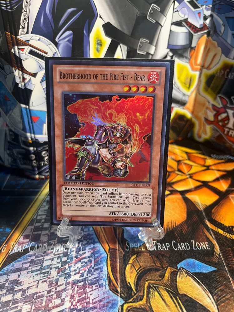 This limited edition Yu-Gi-Oh! card features the Brotherhood of the Fire Fist - Bear character, with a super rare rarity and holo finish. It is made from high-quality card stock material and has Japanese card size. The card is an effect type, with a card number of CT10-EN008 and it is suitable for players aged 6+. The card has a tough defense/defense of 1200 and a powerful attack/power of 1600, making it a formidable addition to any collection. It is not autographed and is in English language. This card is perfect for collectors and players alike, and is sure to make a great addition to your Yu-Gi-Oh! collection.