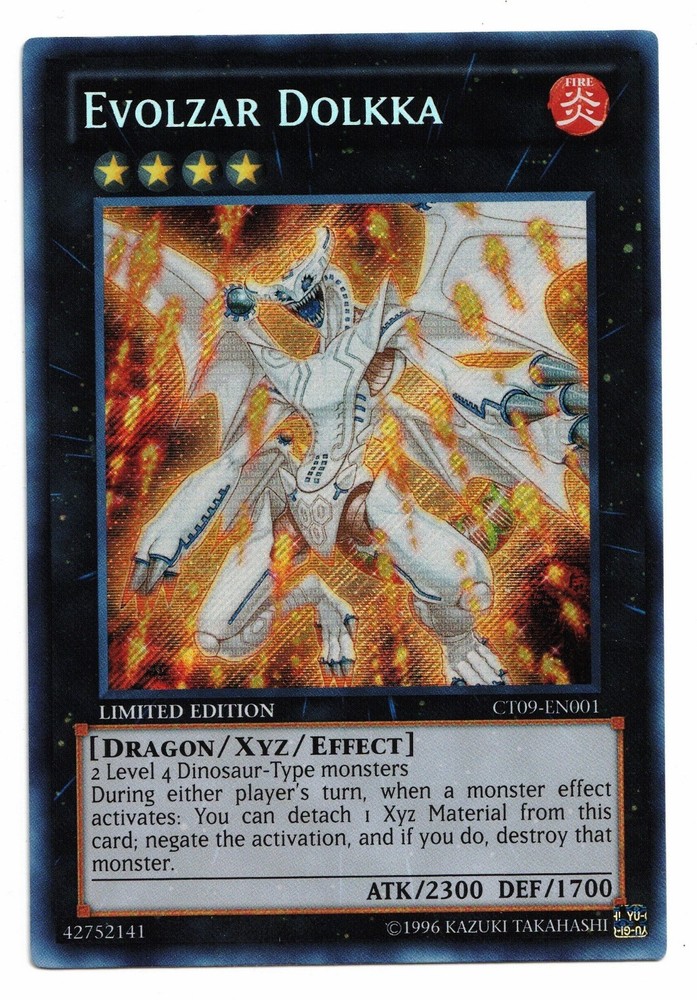 This listing is for a great Yu-Gi-Oh! Card. You get: Evolzar Dolkka CT09-EN001 Limited Edition Secret Rare! This card is in Near Mint Condition. Actual card pictured, please see scan for details. WE COMBINE SHIPPING! ORDER TOGETHER TO SAVE! CONDITION DEFINITIONS: Mint : A perfect or virtually perfect card. We do not sell cards as Mint in order to ensure customer satisfaction. Near Mint : May have some very light edge wear and/or scratching. Excellent : Edge wear and/or scratches becoming more noticeable. May have a few light indentations. Good : Shows signs of play. Has bends, scratches, indentations, minor creases, and/or increasing edge wear. Played : Severe bends, creases, edge wear and/or scratches. Damage is extremely noticeable. POKEMASTER.CARDS SALES INFORMATION: History/Background We specialize in high quality collectibles with great prices, accurate descriptions, and super fast shipping. With thousands of items sold, you can be confident that you will be very happy with your purchase! We add new items all the time, be sure to add us to your Favorite Sellers List. Click the "Save this seller" link above or in our store! Shipping Information Cards are safely packed in a protective plastic sleeve, wrapped in a packing slip, and then reinforced with cardboard and tape. Most cards are shipped via USPS First Class Mail, which usually arrives quickly (within 3-6 business days). WE COMBINE SHIPPING! Be sure to order items together to save big! Customer Service As you can see from our great feedback, we work very hard to ensure that EVERY customer is fully satisfied. Please contact us with ANY concerns BEFORE leaving feedback and we will promptly address any issue. We want 5 STARS in every category and will do what it takes to earn them.