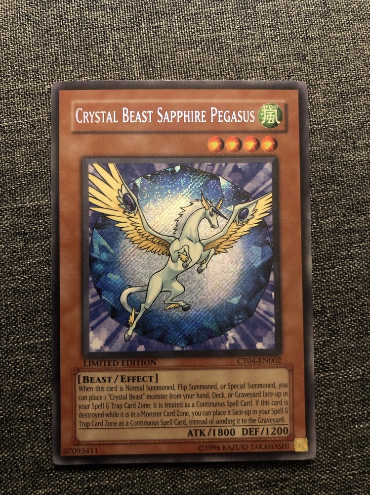 Yu-Gi-Oh! Crystal Beast Sapphire Pegasus - CT04-EN002 - Rare - Limited Edition. Card is lightly played in Excellent Condition. Feel free to reach out with questions.