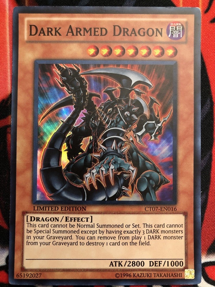 This listing is for x1 Dark Armed Dragon CT07-EN016 Limited Edition Super Rare The card is in Near Mint condition. Since card condition is somewhat subjective, please refer to the picture la provided as that is the actual card the buyer will receive. Shipped safely inside a sleeve + top-loader with cardboard reinforcement.