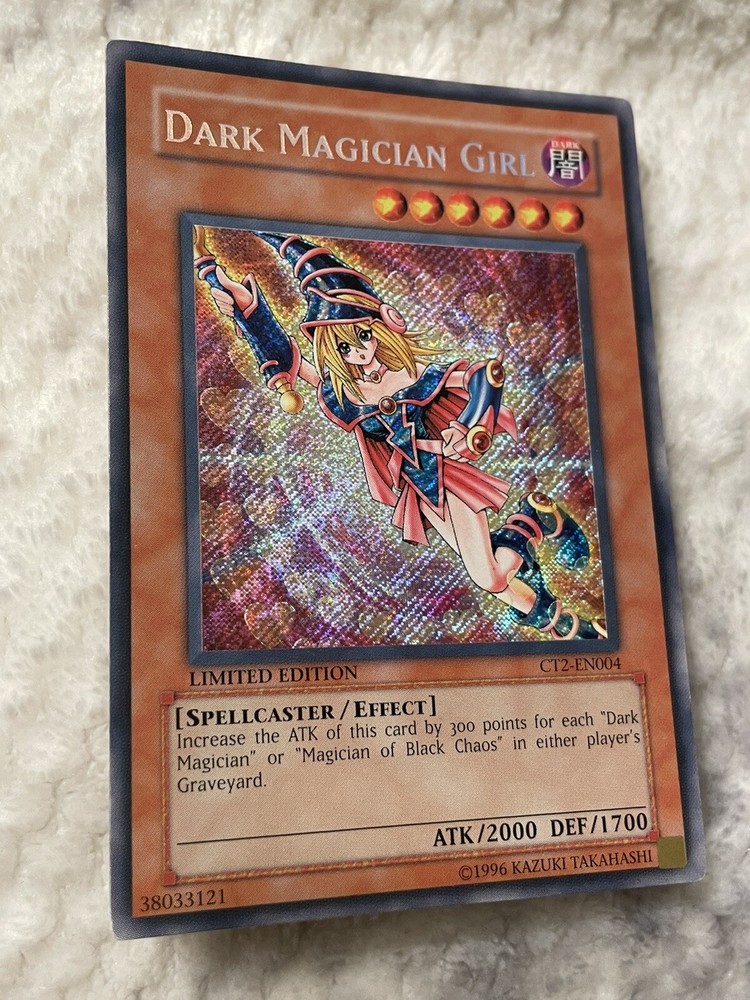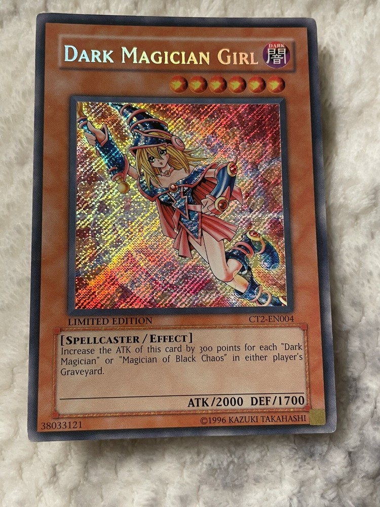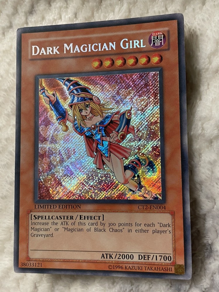 Yu-Gi-Oh! Dark Magician Girl CT2-EN004 Secret Rare Limited Edition Tin Promo. Card is in good condition and will be sent with a sleeve and top loader. Card is from a 2005 collectors tin.
