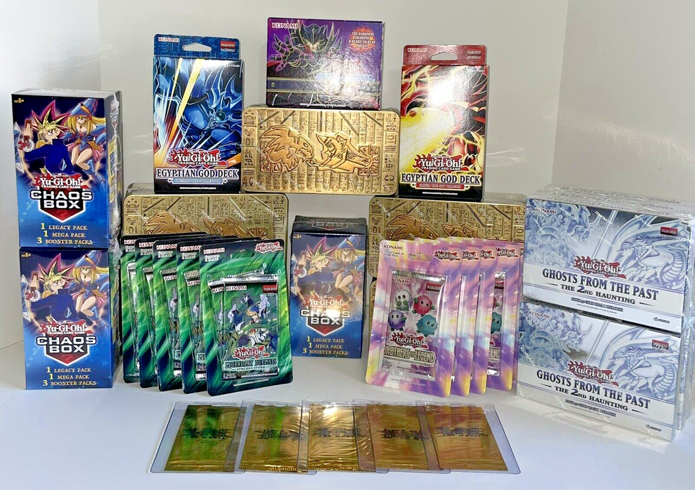 YuGiOh Bundle Lot! Duel Disk Card Launcher Yugi & Kaiba 2021 25th Anniversary BRAND NEW & Factory Sealed. Yugioh Chaos Mystery boxes x3 Yugioh Tins x5 Ghosts from the past 2nd haunting x6 Brothers of legend x5 Legendary Duelists Synchro Storm x5 Yugio Movie Promo's x5 EGYPTIAN God Deck's SLIFER The Sky Dragon x1 & OBELISK The Tormentor x1 x1 Legendary Decks 2 no pic Will be shipped out in 2 separate Boxes.