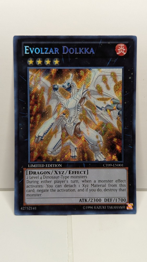 Same Day Shipping, Always Pack Fresh, Always Near Mint This limited edition Yu-Gi-Oh! card features the powerful Evolzar Dolkka, with 2300 attack and 1700 defense/toughness. It is a Japanese-sized, foil-finished card from the 1990 year manufactured by Konami. The card is an Xyz type, with card number CT09-EN001, and belongs to the Yu-Gi-Oh Collectible Tins 2012 set. This card is a Secret Rare with 1st Edition features, and is in English language. It is perfect for collectors and fans of the Yu-Gi-Oh! TCG game. Please note that this card is not autographed and is not considered vintage.