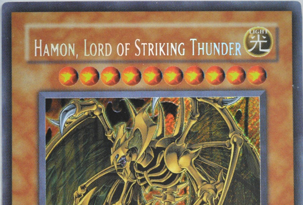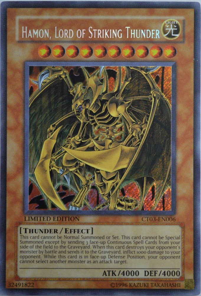 This limited edition Yu-Gi-Oh! card features the powerful Thunder monster Hamon, Lord of Striking Thunder. Its rarity as a Secret Rare and its near mint condition make it a valuable addition to any collection. The card is made of high-quality card stock and has a holographic finish. The card was manufactured by Konami in Japan and is part of the Collectible Tins 2006 Wave 2 set. It is an Effect type card with 4000 Attack/Power and 4000 Defense/Toughness. The card is in English language and is suitable for age levels 6+. It is not autographed and has no mention of its grade or condition in the description. This is a must-have card for any Yu-Gi-Oh! TCG fan and collector.