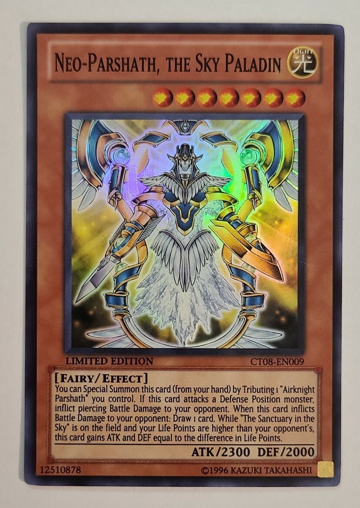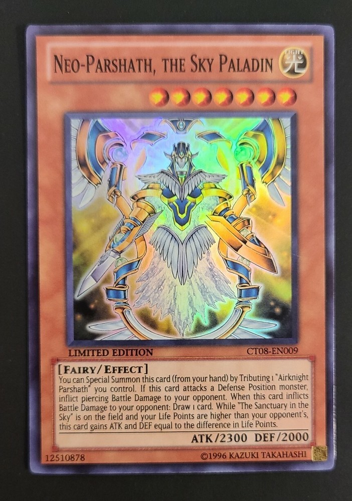 Yu-Gi-Oh! NEO-PARSHATH, THE SKY PALADIN CT08-EN009 Super Rare 2011 Coll. Tins 🍒 Yu-Gi-Oh! NEO-PARSHATH, THE SKY PALADIN CT08-EN009 Super Rare Collectible Tins 2011 Lightly Played: (L@@K PLEASE.) What you read & see is what you get. ***You get one card. Magnetic card holder / case not included.*** May have minor wear, scratches, imperfections, etc but overall good condition. Please examine the pictures of the actual card in this listing before purchase. If you have any questions or concerns please message me. Thank you. Important buyer options & information below. Check out my eBay store: ebay.cjbcollectibles.com for more Yu-Gi-Oh! Pokémon, Magic The Gathering, Comic Books and other collectible items. CjB Collectibles (brattyangel9494) with legendary customer service, real pictures, fast and professional shipping! Why settle for anything less? You deserve better! Our ebay store at: ebay.cjbcollectibles.com We normally try to respond to questions promptly however please allow us up to 24 hours for a response. Response time may be delayed on weekends and holidays. Thank you for your patience. eBay.CjBCollectibles.com Shipping Returns Item assesment & conditions Questions & Feedback CJB Collectibles offers Domestic and International shipping. Worldwide Shipping. Domestic (USA) customers have 2 choices of shipping at checkout: At checkout default is FREE / ECONOMY shipping. You get: Minimal protection with a standard envelope or economy mailer. Tracking may not be available. OR ***** (We Recommend) ***** $4.99 Standard / First Class shipping. You get: Premium packaging & First Class shipping. Your items will be in a secure bubble mailer or box. You will receive a tracking number. We give our customers options therefore we will not be held liable for unreliable / no tracking or damage to merchandise during delivery. We ship same business day or next business day. We hope you will love your purchase at CjB Collectibles, however if you need to return it, we have a 30 day return policy. All items must be returned in the same way as it was sent, including original sleeves, top loaders, bags, backing board, etc. If not returned exactly as it was sent then there may be fees imposed and will be reported to eBay. If you have any questions or concerns please use the "contact us" . We go above and beyond for our customers. Before contacting eBay, your bank card or payment provider, or leaving Neutral or Negative feedback please "contact us" first. Mistakes may happen but we will work with you to give you a pleasant and positive experience at CjB Collectibles. We are not professional card graders however we have many years of dealing with Graded & Non-Graded, Sports & Non-Sports cards and your opinion on condition may differ from ours. It is recommended and expected for the buyer to examine the pictures carefully to avoid condition conflicts. We are very transparent and use a high power camera with different background contrasts in our live pictures so that you may see all or most details with ease. The first 5 pictures will be flat images and if there is a hard to see detail or defect it will be shot on an angle after the 5th image for clarity. We want you to know what you are buying, yes it is important to us. We do not use stock images. If there is a condition concern or any question please be courteous and message me rather than using eBay as your first option for a resolution and I will work with you to answer or resolve it immediately. There is no need to open any claim and bring a 3rd person (eBay) when we can resolve any problem with ease. I usually respond quickly but please allow me up to 24 hours to respond as I strive for excellent customer service with a smile. Please before contacting eBay, payment provider, or leaving negative or neutral feedback, please contact me / message me with your concerns or questions and I will address it as soon as possible to resolve any issues. I usually respond promptly but please allow me up to 24 hours to respond to your concerns. I strive for excellence in customer service and your thoughts are important. Thank you. I use an automated feedback program that is set to where as soon as the buyer leaves a positive feedback the program automatically leaves you a positive feedback as well. If you do not leave feedback than you will not receive feedback. If you want to opt out for a feedback reminder please message me. If you leave feedback and you did not receive feedback than please contact me so I can manually enter the feedback for you. There will be an automated feedback reminder that after a few days if you did not leave feedback the program will send you a reminder. There is no obligation to leave feedback however, I am hoping that if I provide you with an outstanding product and service that you would be so kind and let others know via "leave feedback" . ABOUT US CjB Collectibles sells and buys all sorts of TCG's like Pokémon & Yu-Gi-Oh!, anime, comic books, toys, collectibles & more! 😁 You can enter directly from any browser by copy and paste our store link: www.ebay.cjbcollectibles.com We are based in New Jersey and have been collecting Sports and Non-Sport cards, comic books and toys since as far back as the late 70's. We run the store with family and we try to keep prices very fair and reasonable so that we can all have fun collecting and playing TCG's. I want everyone to have fun and go "gotta catch em' all" eBay listing template by 3D sellers.com - Try for Free!