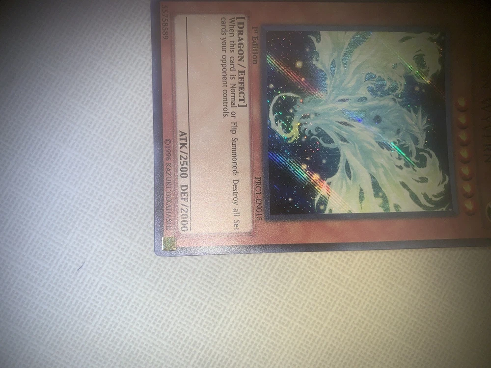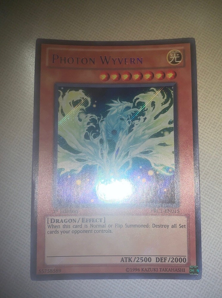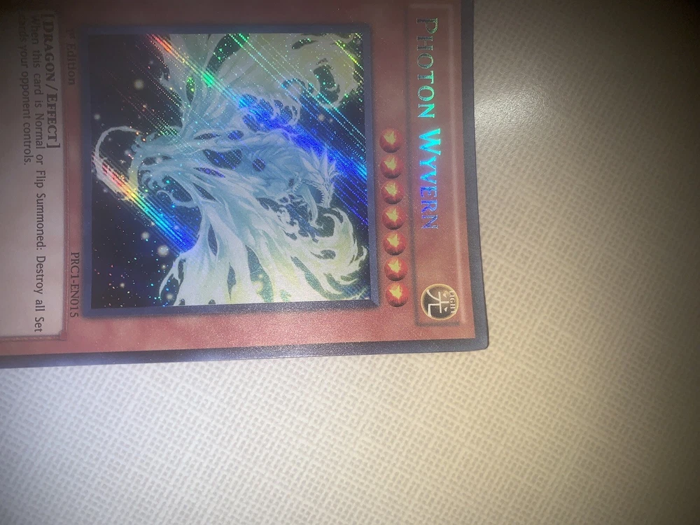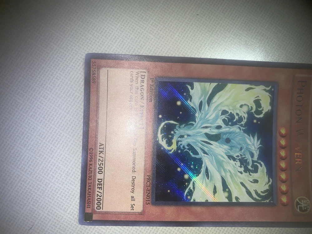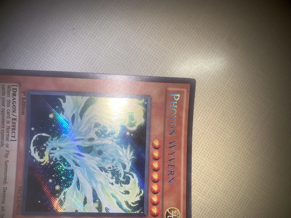 Up for sale is this amazing Yu-Gi-Oh! card with the card number Prc1-En015. This beautiful card is from the 2012 Premium TiN Set and is a 1st Edition Secret Rare NM. The card features the incredible Photon Wyvern, a light-colored dragon with an attack power of 2500 and a toughness of 2000. This card is perfect for collectors of CCG individual cards and anyone who loves the Yu-Gi-Oh! TCG game. It is in excellent condition and features a holo finish. Don't miss out on the opportunity to add this rare card to your collection!