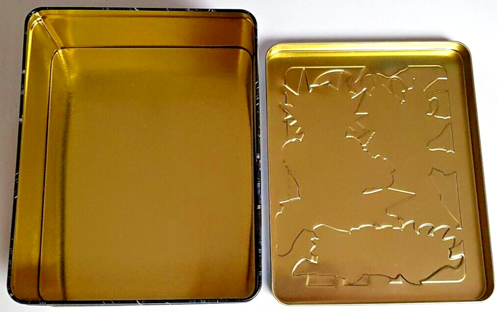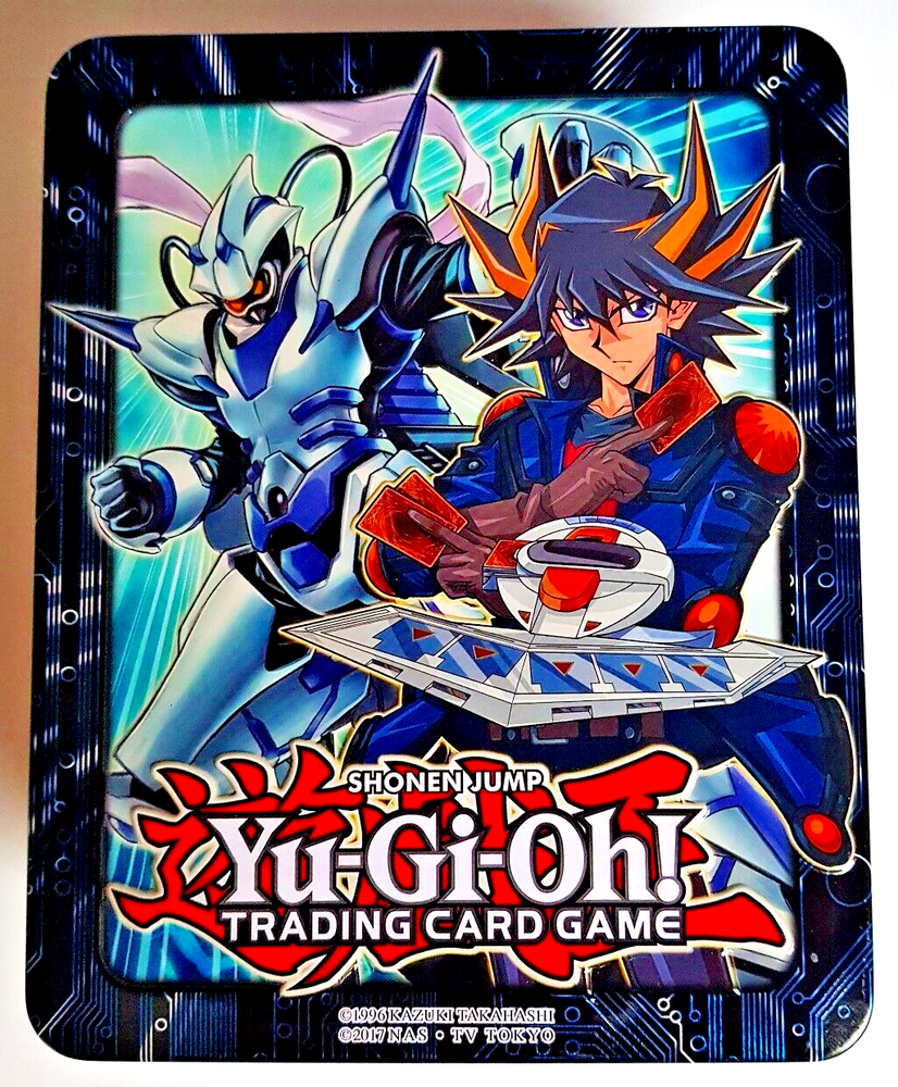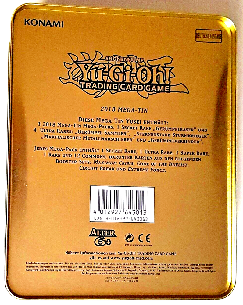 Yu-Gi-Oh! - Shonen Jump - Trading Card Game - Mega-Tin Yusei - 2018 Mega-Tin - 2017 - leere Sammelbox - gebraucht, Original, geöffnet, genutzt bzw. nicht eingeschweißt, verpackt Marke: Yu-Gi-Oh! - Sprache: Deutsch - Größe: ca. 14,5 x 17,5 x 7,5 cm - Material: Metall - Verschluss: Steckverschluss - Hinweise: leere Sammelbox, ohne Inhalt, ohne Zubehör Inhalt: 1 leere Sammelbox Der Artikel wird wie abgebildet versendet. Der Artikel ist eine Gebrauchtware, Original, geöffnet, genutzt bzw. nicht eingeschweißt, verpackt. Der Artikel weist einige Gebrauchsspuren auf und ist in einem guten Zustand. (Vorderseite, Rückseite, Innenseiten: einige Dellen, Knicke, Kratzer, Gebrauchsspuren, Abnutzungsspuren).