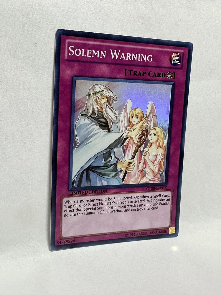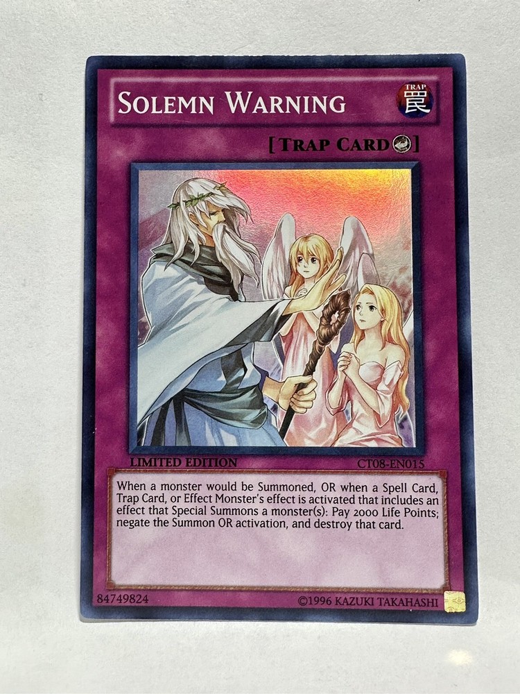 YuGiOh! Solemn Warning - CT08-EN015 - Limited Edition - Super Rare - Near Mint. Please take a look at my other listings for I do combine shipping for a cheaper shipping rate, also if there is a specific card(s)/coin(s)/item that your looking for please don’t hesitate to ask. I may have the item you’re looking for. 🙂 This auction is a great item that you or someone you know would love to have. So please check all pictures to determine the condition for yourself, for this will be the item(s) the winner of this auction wins. SHIPPING AND RETURNS: I have a 1 day to same day handling on shipping, of course Sundays (no usps running) there is nothing I can do but get it out first thing Monday mornings. Once shipped, it will usually takes 3-5 business days to arrive at your door, sometimes less! Please be advise with the winter season coming USPS might be running slower than normal so please be patient and know that once it’s in the mail I have ZERO control of the item. I respectfully ask that you communicate with me if there is a problem before leaving a negative review. I am here to help as best as I can. Please advise that there will be NO Returns / Refunds on items as you understand your buying the item in the pictures as is. Please message me if you have any questions. Happy bidding