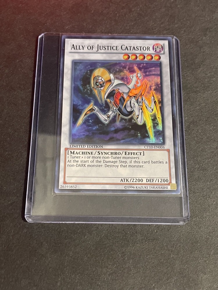 For all Yu-Gi-Oh! TCG collectors out there, here's a rare find - the Ally of Justice Catastor 2013 CT10-EN006 Limited Edition Holo Rare card. This Synchro/Effect Monster card is from the 2013 Collectors Tins set and features the Machine Creature/Monster Type. It's perfect for those who want to add a unique and hard-to-find card to their collection. Additionally, this card is a great addition to any collection of rare cards and features a unique Card Name and Card Number - Ct10-En006. Don't miss out on this opportunity to add a Limited Edition card to your collection! Shipped in soft sleeve and top loader.