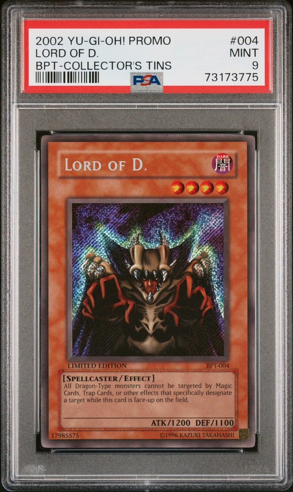 This Yu-Gi-Oh! TCG card boasts a Dark attribute and features the character Lord Of D. It is a Spellcaster monster card with an attack power of 1200 and defense/toughness of 1100. Manufactured in 2002, it belongs to the 20022003 Collector's Tins set and has a card number of Bpt-004. This limited edition card is graded PSA 9 MINT by Professional Sports Authenticator.
