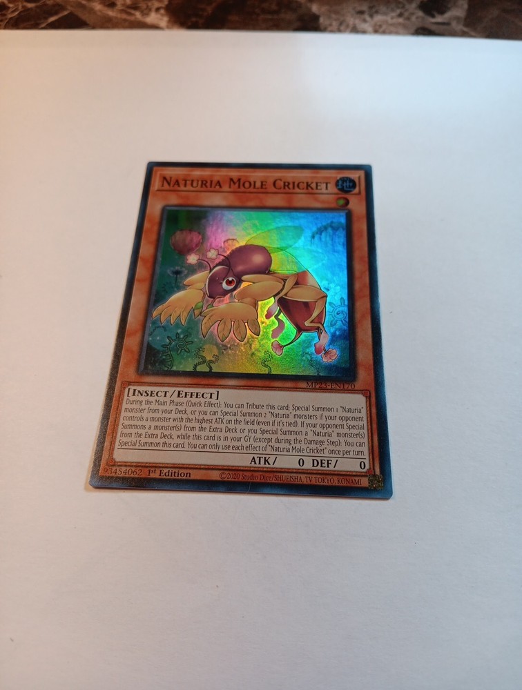 This Yu-Gi-Oh! TCG card features the Naturia Mole Cricket, a Super Rare insect creature with 0 attack and defense. It belongs to the 25th Anniversary Tin: Dueling Heroes Mega Pack set and has an Effect card type with a card number of MP23-EN170. The card is in 1st edition and is perfect for collectors and players of the game. The card's color is Earth and it is a great addition to any collection of collectible card games. The card is named after the creature, Naturia Mole Cricket, and is perfect for those who love the game's theme. This card is a must-have for any Yu-Gi-Oh! TCG player or collector.
