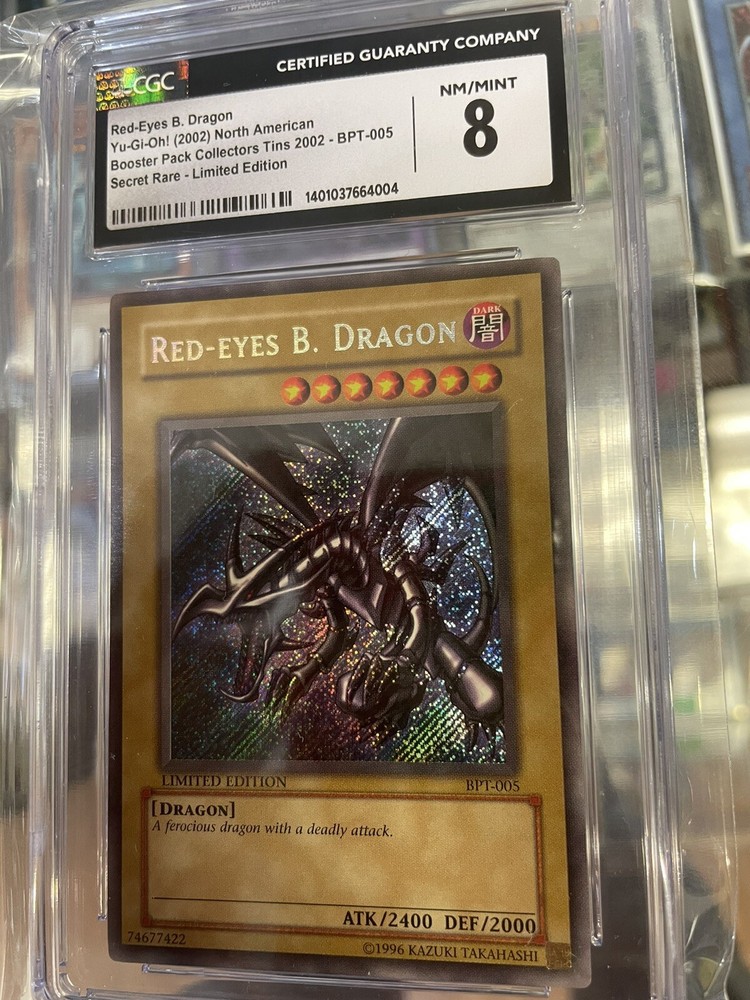 This limited edition Yu-Gi-Oh! TCG card features the iconic Red-Eyes B. Dragon, with a Secret Rare rarity and BPT-005 card number. The card is part of the 20022003 Collector's Tins set, and is a Normal card type with a Dark attribute and Dragon creature/monster type. With a powerful 2400 attack and 2000 defense, this card is a must-have for any serious Yu-Gi-Oh! TCG collector or player. The card also boasts a unique design and is perfect for display or use in competitive play. Don't miss out on the chance to add this rare and sought-after card to your collection!