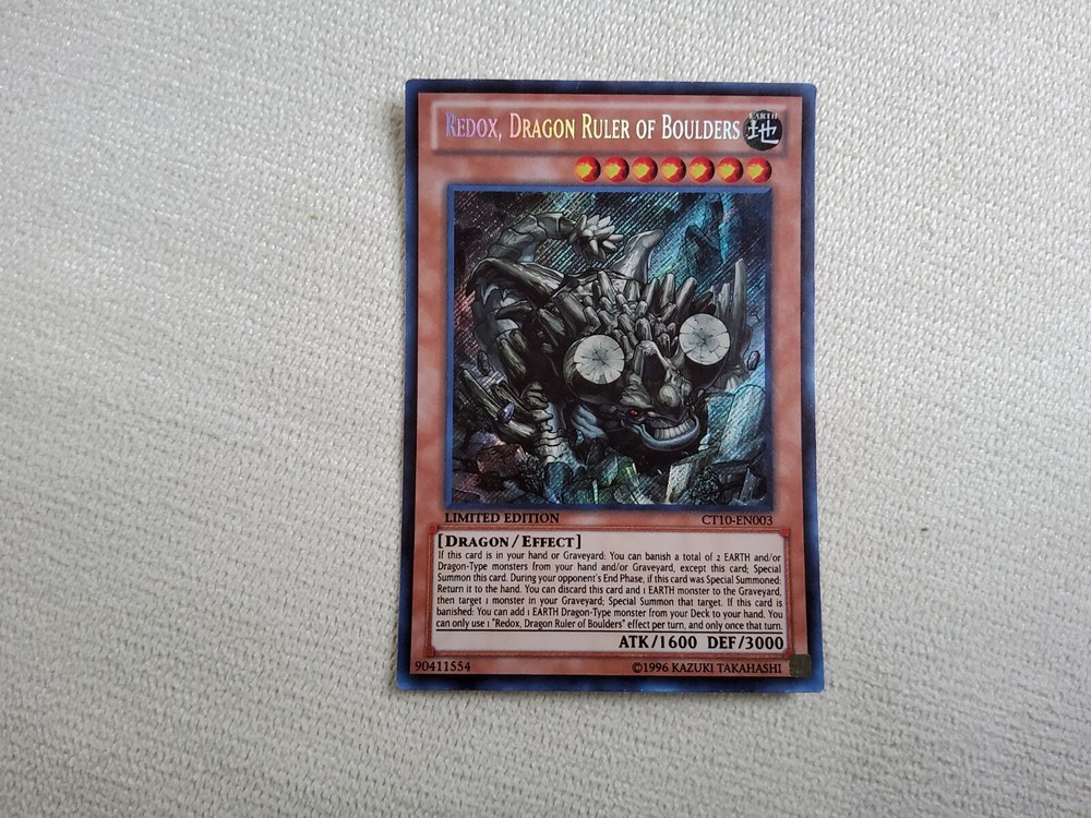 This limited edition Yu-Gi-Oh! TCG card features Redox, Dragon Ruler of Boulders with an attack power of 1600 and defense/toughness of 3000. The card is from the 2013 set and has the card number CT10-EN003. It is a Dragon/Effect type card with the rarity of Secret Rare and the creature/monster type of Dragon. The card is perfect for collectors and players of the Yu-Gi-Oh! TCG game.