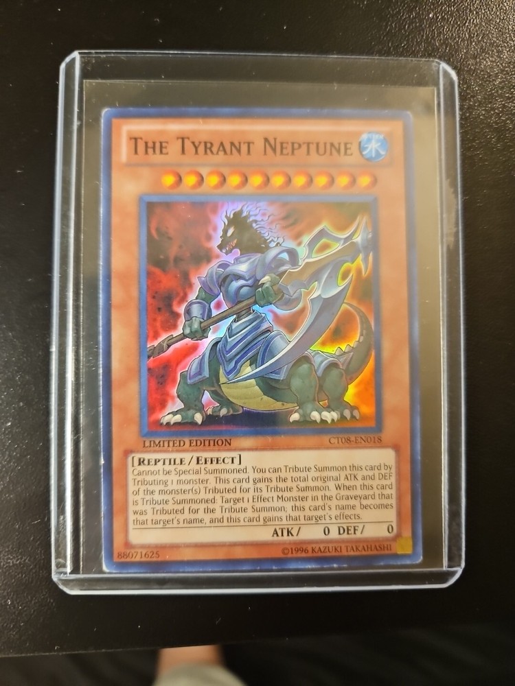 This limited edition Yu-Gi-Oh! TCG card features The Tyrant Neptune and is a must-have for any collector. With a super rare rarity and a holo finish, this card is sure to impress. The card is made of high-quality card stock and has a unique design, making it a great addition to any collection. The card number is CT08-EN018 and it was manufactured by Konami in the United States. The card is in English language and has 0 defense/toughness and 0 attack/power. It is not autographed and not vintage. This card is from the 2011 Collectors Tins set and is perfect for any fan of the Yu-Gi-Oh! TCG game.