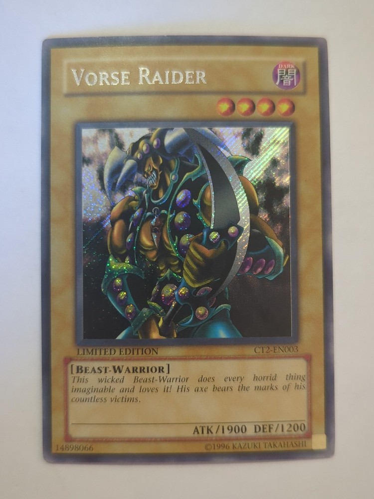 Yu-Gi-Oh! TCG Vorse Raider CT2-EN003 Limited Secret Rare NM. This card is near mint. *All cards sold will be inside of a penny sleeve and top load card holder. Packaging will be in a bubble envelope for extra protection.* **In an attempt to empty my collection, every order will come with a gift of additional sleeved cards of various conditions that may fit the theme/archetype (depending on what's remaining in my collection). The bigger the sale, the bigger the gift!**