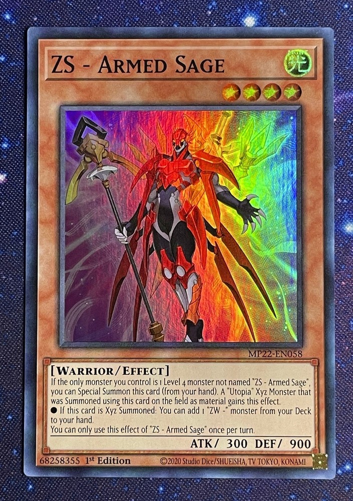 This Yu-Gi-Oh! TCG card is a 1st edition ZS - Armed Sage from the 2022 Tin of the Pharaohs Gods set. It features a Light-colored Warrior-type Effect/Monster with 300 Attack/Power and 900 Defense/Toughness. The card is made of high-quality card stock with a beautiful Holo finish. This collectible card is in near mint or better condition and is perfect for fans and collectors of the Yu-Gi-Oh! TCG. Has no residues, scratches, or indents. Has never been played before. The card is in English, and it is not autographed or vintage. The MP22-EN058 card number and Super Rare rarity provide additional value to this card. It is appropriate for ages 6+ and is an excellent addition to any CCG individual card collection. Shipping with USPS Standard Mail. Comes with FREE Non-Machinable shipping.