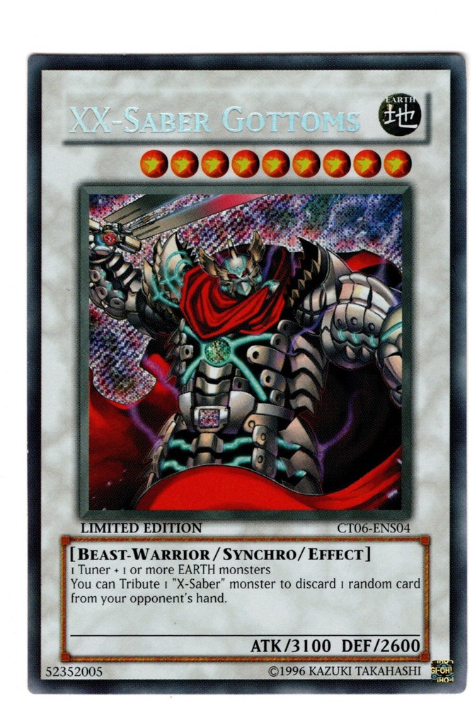 What's Included: Cds Card Name Rarity Edition Set Code Condition 1 XX-Saber Gottoms Secret Rare Limited CT06-ENS04 Light Play Additional Comments: All Pictures are scans of actual product(s) Light Play Shipping/Feedback: **International Buyers** Total Shipping on all Combined orders will be $14.00 100% Positive & 5 Star Feedback 3 Years Running Orders Paid before 12:00 PM ET are shipped SAME DAY. Cards are shipped in penny sleeve(s) and toploader(s). Bubble Envelope and Tracking on Higher Cost Items. Card Grading: Grading cards is a subjective art form. I try to follow the TCGPlayer(Recently purchased by eBay) grading guide. Sometimes I will even put a grade like Very Light Play or Light to Moderate. The reason for that is because a card could be on the High or Low end of a Grade. Near Mint (NM) - Mostly clean card with very few flaws. Card should have clean corners with no wear but could have a tiny ding at a corner or edge. There could be some minor scuffing and scratches more so on the back. I am stricter regarding the front of the card. Keep in mind I even open fresh packs and get cards with scratches and corner dings. If you are a card collector message me if you have any questions. Especially for cards from older sets. Light Play (LP) - Cards will have some corner and/or edge wear. There could be a small bend but nothing major. There could also be some minor scuffing on the front. If I see more than a few dings, nicks and scratches I willl downgrade the card to Moderate Play. Moderate Play (MP) - Cards have a wide range of conditions. This could include cards that are very close to Light Play or close to Heavy Play. Expect some bends and/or a crease or two. I don't usually sell cards in this condition so it you want an exact grade please contact me. Heavy Play(HP) - What can I say. The card is a total wreck. Creases and heavy wear.