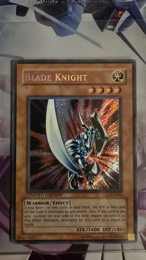 Unleash the power of the Blade Knight, a limited edition misprint from the Yu-Gi-Oh! TCG, an essential for collectors and duelists alike. This secret rare card, numbered CT1-EN002, boasts an impressive holo finish that will shine in the spotlight of your next battle or display case. As a warrior-type effect monster, it can turn the tide of any game, adding both strategic depth and visual appeal to your deck. Blade Knight is presented in English and remains ungraded, reflecting its lightly played status. Its rarity and the prestige of being a Collector's Tin Promo make it a noteworthy addition to any collection. Crafted by Konami, this card is a testament to the intricate design and lore that the Yu-Gi-Oh! trading card game is renowned for.
