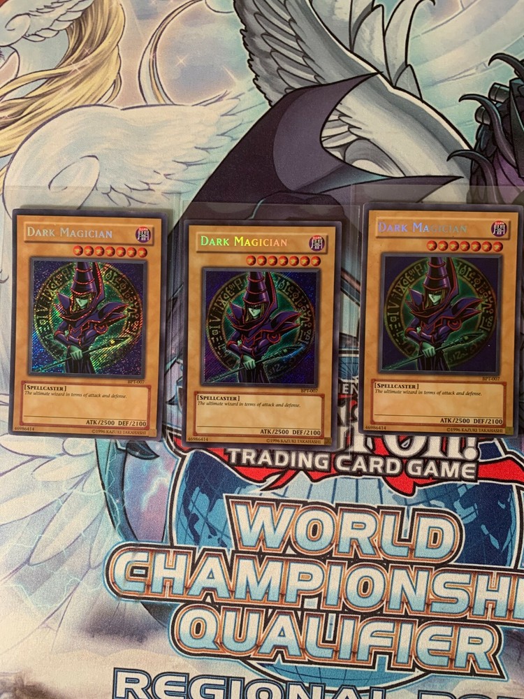 Yugioh - Dark Magician(3) - BPT-007 - Limited Edition - Secret Rare Cards are photographed in a protective sleeve and can be photographed outside sleeves for interested buyers. Cards have some minor wear around edges and one has some black spots (either dirt from a card box or ink from the previous owner of the card). Any questions please ask.