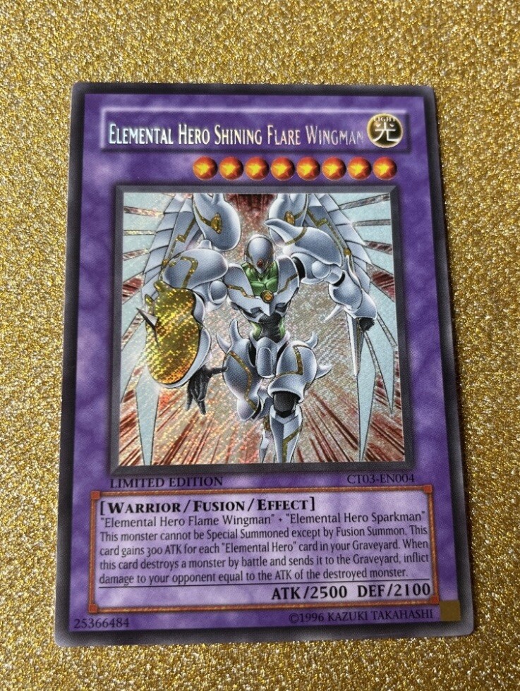 Yugioh Elemental Hero Shining Flare Wingman collectors tins CT03-EN004 Secret Rare Limited Edition See photos for item Condition Sold as-is, exactly what the item description and title describes. All sales are final, NO returns Stored in non-smoke environment Item is packaged and carefully wrapped when shipped. Please contact with any questions Thank you and it’s time to duel!